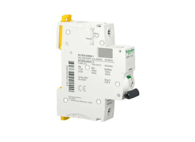 Este mini disjuntor possui proteção IP20, pode ser montado em trilho DIN e é adequado para isolamento industrial conforme IEC 60947-2. Conta também com travamento duplo para desmontagem com o pente de conexão. Além disso, oferece uma ampla gama de dispositivos adicionais e de alta imunidade contra fugas à terra. O seu isolamento classe II em quadros de distribuição garante que a distância entre o disjuntor e os componentes internos do aparelho seja o dobro do exigido pelas normas aplicáveis, proporcionando a máxima proteção. Possui também uma ampla faixa de operação, atuando em temperaturas de -35°C a 70°C. Este interruptor termomagnético também está totalmente coordenado com a linha de proteção diferencial Acti9 e com os disjuntores Compact NSX. O produto está em conformidade com IEC 60898-1 e 60947-6 Os disjuntores Acti9 iC60N levam o selo Green PremiumTM, que promete conformidade com as mais recentes regulamentações, transparência nos impactos ambientais, produtos circulares e de baixo CO2.