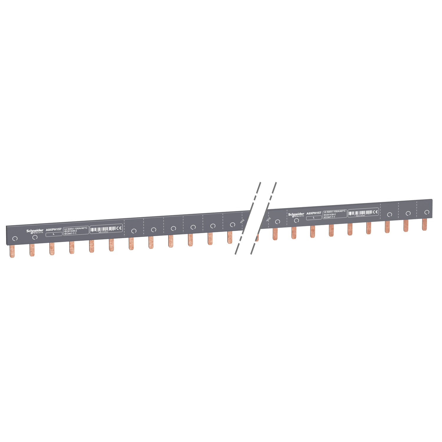 O barramento pente Acti9 da Schneider Eletric é projetado para facilitar a vida do eletricista ao realizar a ligação dos dispositivos de proteção de maneira segura e rápida.O A9XPH157 possui 1 polo, capacidade de 100A, 57 módulos e opera na tensão de 415VCA.