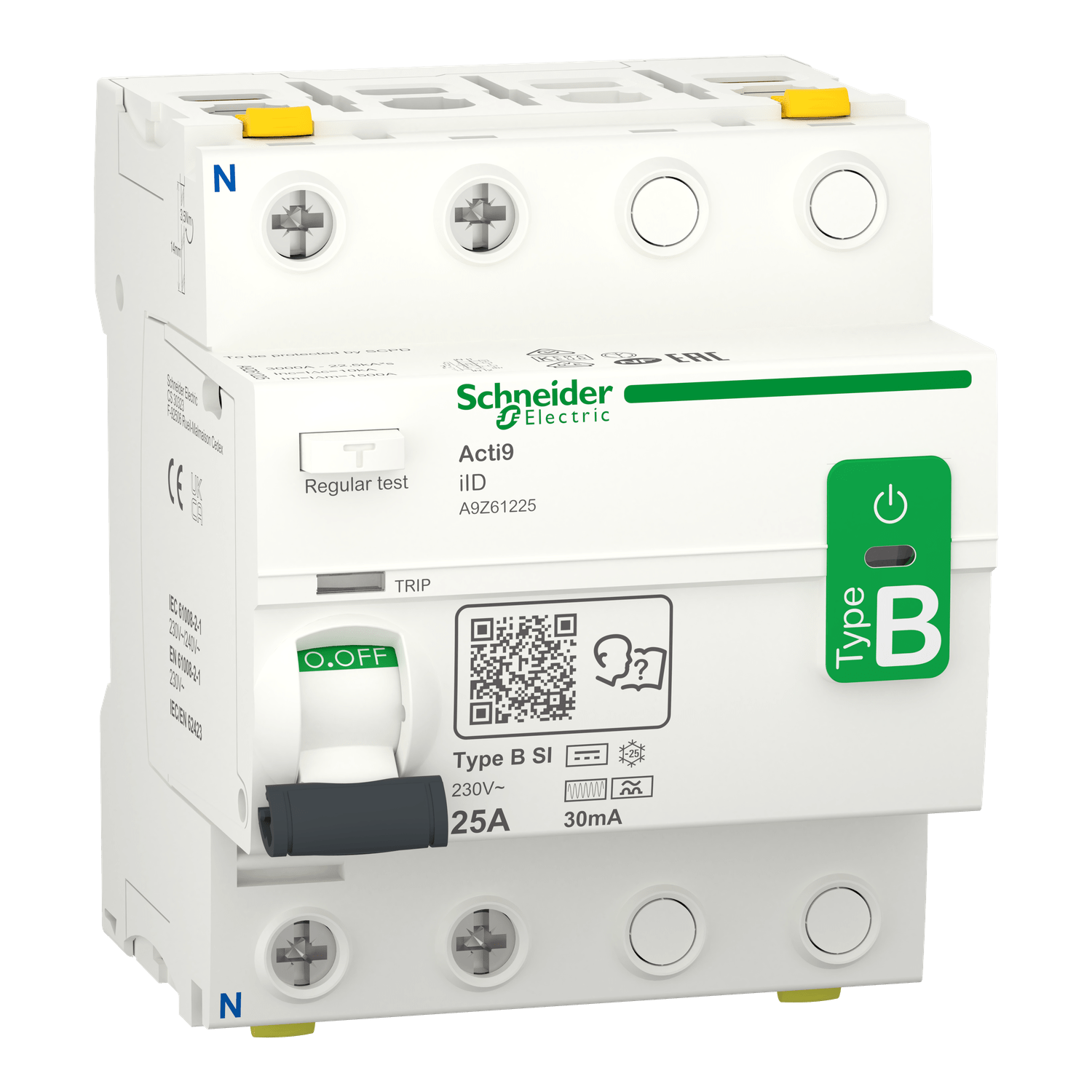 Os interruptores Diferencias Residuais (IDR) Acti9 iID protegem pessoas contra choques elétricos causados por fuga de corrente,e também instalações contra riscos de incêndio causados pela corrente de fuga à terra.O A9Z61225 possui 2 polos, capacidade de 25 classe de proteção B-SI, sensibilidade de fuga à terra de 30mA, capacidade de interrupção de 10kA em 220/240VCA (61008-1).