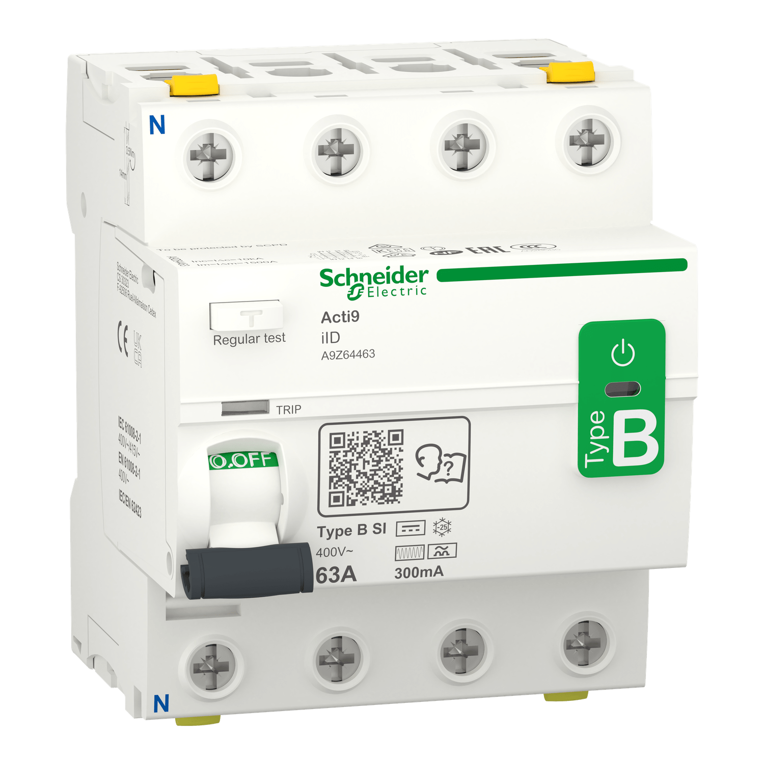 Os interruptores Diferencias Residuais (IDR) Acti9 iID protegem pessoas contra choques elétricos causados por fuga de corrente,e também instalações contra riscos de incêndio causados pela corrente de fuga à terra.O A9Z64463 possui 4 polos, capacidade de 63 classe de proteção B-SI, sensibilidade de fuga à terra de 300mA, capacidade de interrupção de 10kA em 400VCA (61008-1).