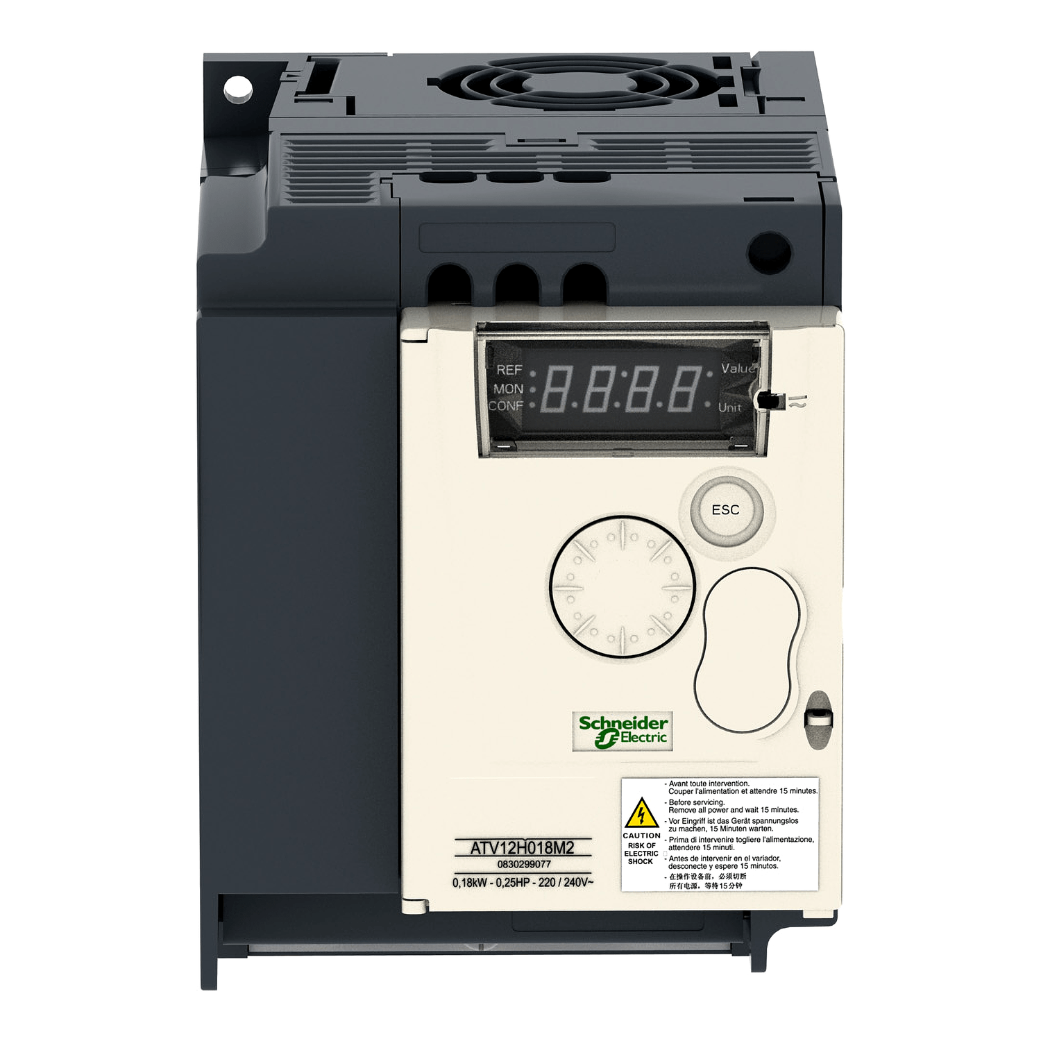 Pequeno no tamanho e gigante no desempenho, os inversores de frequência da linha AltivarTM Machine 12 são ideais para aplicações simples e de pequeno porte como máquinas comerciais, sistemas HVAC, bombas, esteiras, cancelas, entre outros. O modelo ATV12HU15M2 possui alimentação monofásica de 200...240Vac, potência de 1,5kW/2CV e corrente de saída de 7,5A.