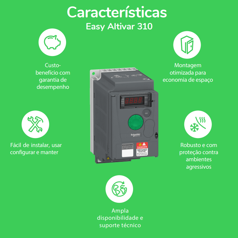 Os inversores de frequência da linha Easy Altivar 310 garantem as funções necessárias com preço justo sem compremeter a qualidade! Isso além de funções integradas que os tornam adequados para as aplicações mais comuns, incluindo máquinas têxtil, transporte de materiais, máquinas de cerâmica, embalagem e empacotamento, ferramentaria e máquinas de madeira. O modelo ATV310HD11N4E possui alimentação trifásica de 380...460Vca, em regime HD possui potência de 11kW/15CV e corrente de saída de 24A . Já em regime ND, possui potência de 15kW/20CV e corrente de saída de 30A .