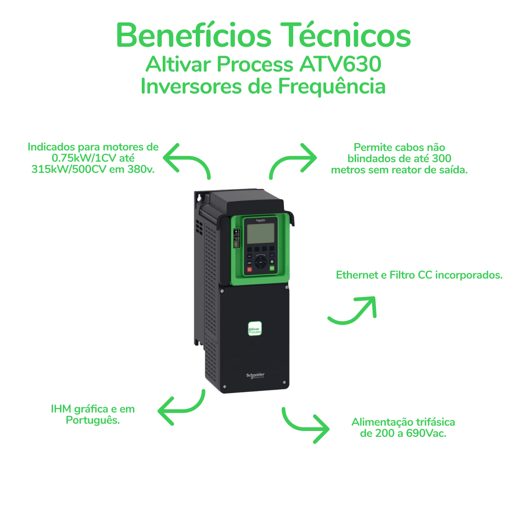 Os inversores de frequência da linha Altivar Process 600 atendem as principais necessidades dos processos, pensando na eficiência dos equipamentos e economia de energia. Estes produtos estão focados em aplicações de gestão de fluidos e gases, atendendo setores de Tratamento de água, Mineração, Óleo e gás e Alimentos e Bebidas. O modelo ATV630C11N4 é recomendado para motores com range de potência de 110kW / 150 hp, para aplicações que requerem sobrecarga leve (até 120%), e 90kW / 125 hp, quando requerem sobrecarga alta (até 150%), e possui alimentação trifásica de 380...480Vac.