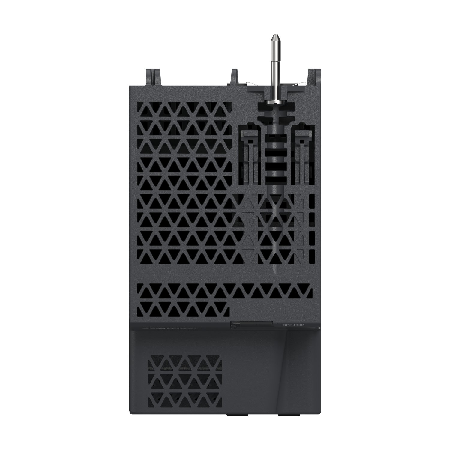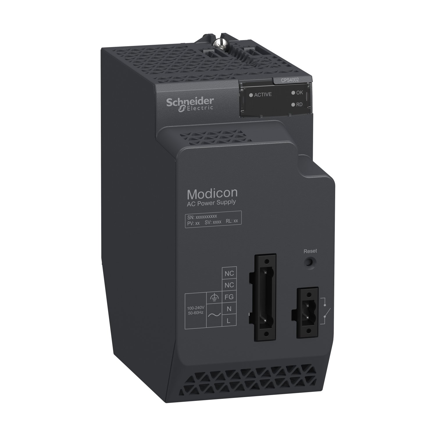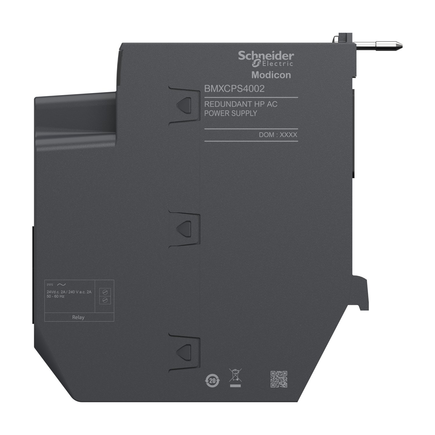 O BMXCPS4002 faz parte da linha de produtos Modicon X80 e é um módulo de fonte de alimentação. Ele é compatível com todo o backplane, proporcionando diagnósticos avançados disponíveis por meio da rede. Algumas das características notáveis incluem sensoriamento de temperatura, teste de redundância, informações sobre a vida útil restante e suporte para tensão primária na faixa de 100 a 240 V em circuito CA.O consumo de energia varia de acordo com a voltagem, com potências secundárias de 18 W (3,3 V CC) para a fonte de alimentação lógica do módulo E/S e 40 W (24 V CC) para o processador e fonte de alimentação do módulo E/S, se o 3,3 V não estiver carregado. O módulo possui proteções contra sobrecarga, sobretensão e curtos-circuitos. Ele apresenta LEDs indicativos para a presença de tensões, redundância OK e status da fonte de alimentação. O controle é realizado por meio de um botão de pressão de reinício a frio (REPOR). A conexão elétrica inclui bornes para alimentação da linha e aterramento de proteção, além de um relé de alarme. Em termos de meio ambiente, o BMXCPS4002 é robusto, com resistência à vibração de 3 gn e resistência ao choque de 30 gn. Possui classificação IP20 para proteção contra poeira e ingresso de água. Sua faixa de temperatura operacional vai de 0 a 60 °C, e pode ser armazenado em temperaturas entre -40 e 85 °C. Este módulo atende a várias diretivas, incluindo a Diretiva de Baixa Tensão e a Diretiva de Compatibilidade Eletromagnética. Além disso, possui características ambientais específicas, como 3C3 e 3C4 conforme EN/IEC 60721-3-3.
