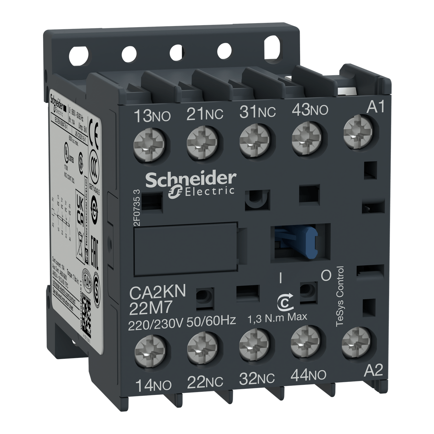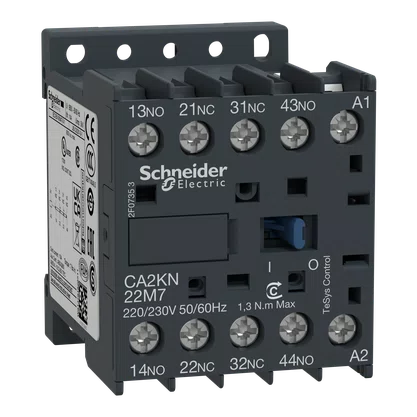 Contator auxiliar TeSys K, 4 contatos (2NA + 2NF), 10A/690V, para controle de cargas eletromagnéticas AC-15/DC-13.,Ele fornece um circuito de controle de 220-230V 50/60Hz CA, conexão por terminais de braçadeira de parafuso.,Para altas taxas de operação até 180 ciclos/min e temperatura ambiente -25/+50°C, obtém alta confiabilidade e durabilidade.,Compacto (largura 45mm), para encaixe em trilho DIN 35mm ou fixação por parafuso.,Certificação multipadrões (IEC, UL, CSA, CCC, EAC), produto Green Premium (RoHS/REACh).