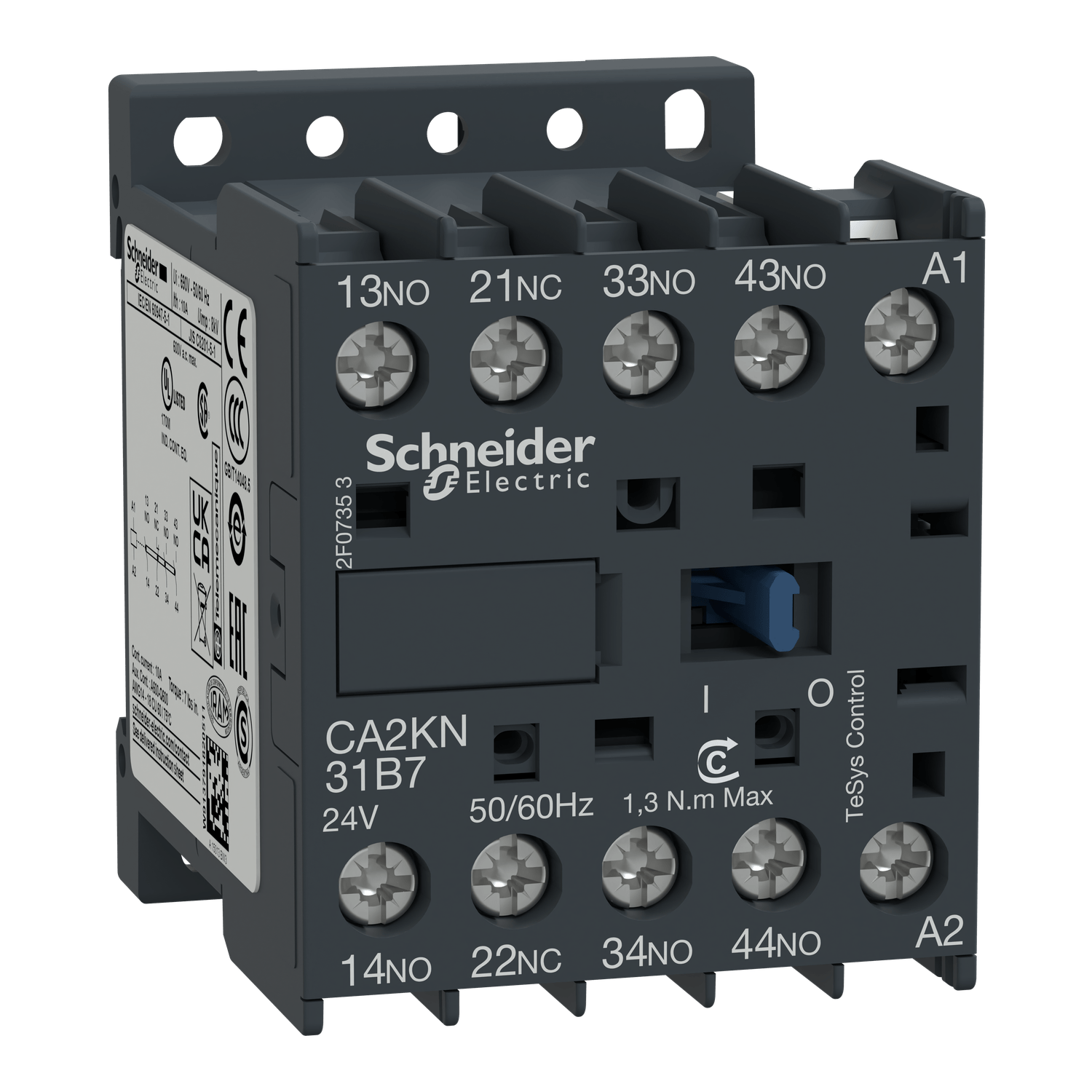 Contator auxiliar TeSys K, 4 contatos (3NA + 1NF), 10A/690V, para controle de cargas eletromagnéticas AC-15/DC-13.Ele fornece um circuito de controle de 110V 50/60Hz CA, conexão por terminais de grampo de parafuso.Para altas taxas de operação até 180 ciclos/min e temperatura ambiente -25/+50°C, obtém alta confiabilidade e durabilidade.Compacto (largura 45mm), para encaixe em trilho DIN 35mm ou fixação por parafuso.Certificação multipadrões (IEC, UL, CSA, CCC, EAC), produto Green Premium (RoHS/REACh).