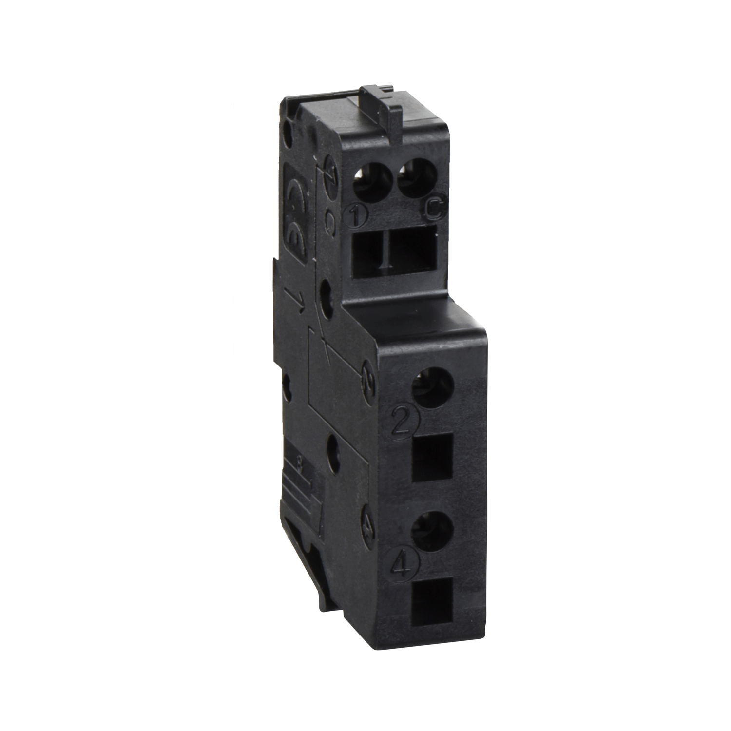 Este é um único contato auxiliar padrão que fornece duas informações remotas sobre o status do disjuntor. É usado em dispositivos Compact NSXm e PowerPact B. O contato OF (aberto/fechado) indica a posição dos contatos principais do disjuntor. O contato SD (indicação de disparo) indica se o disjuntor disparou. Há um modelo de contato auxiliar para informações OF e SD, dependendo de onde ele está instalado no dispositivo. Este auxiliar é um contato do tipo comutador de ponto comum com 1 contato normalmente aberto e 1 contato normalmente fechado. A corrente nominal é 5A e a carga mínima é 2mA a 17VDC. As categorias de utilização são AC12 / AC13 / DC12 / DC13 / DC14. O Compact NSXm tem 2 contatos auxiliares e sua presença é visível no painel frontal graças às bandeiras verdes. Está em conformidade com a norma IEC 60947-5-1.