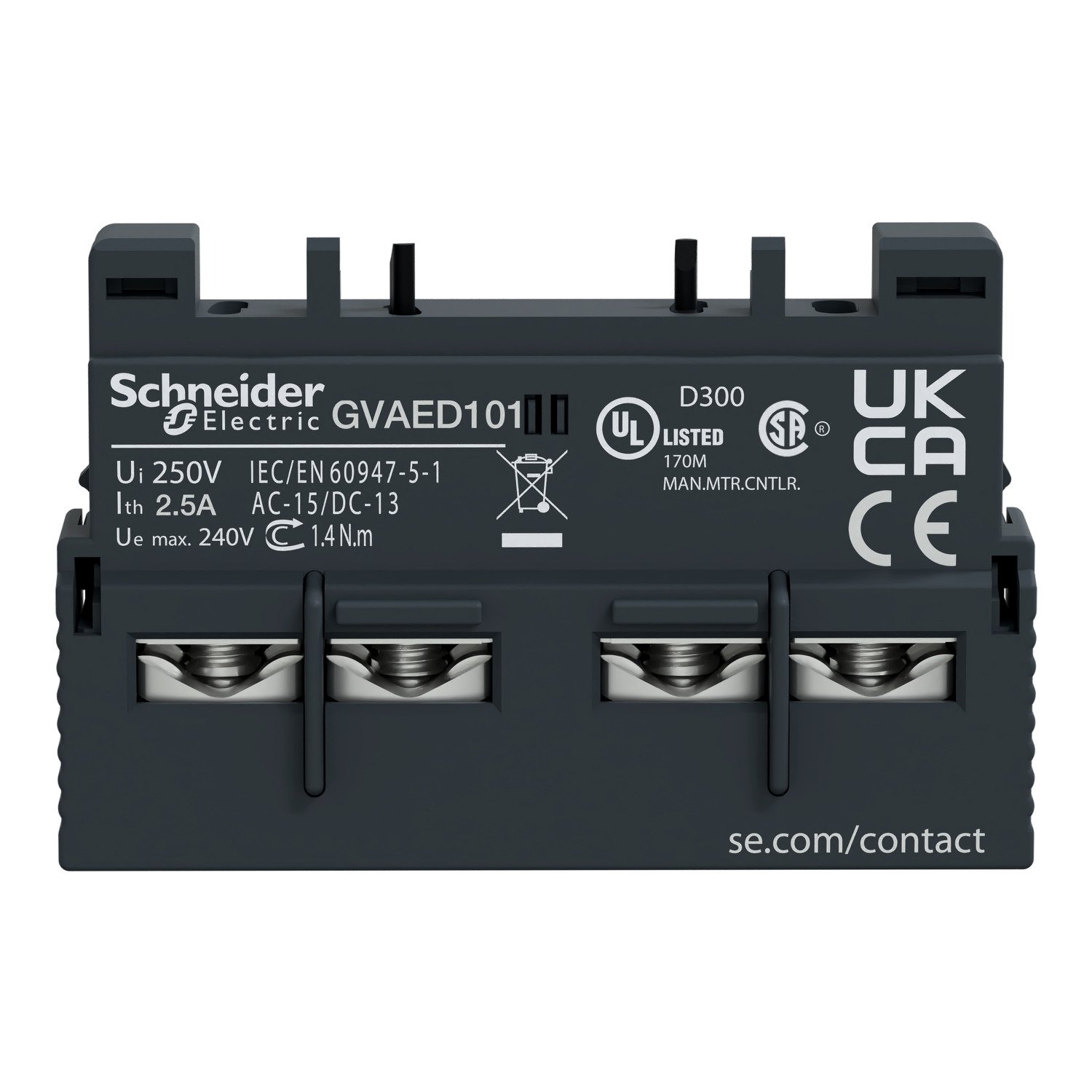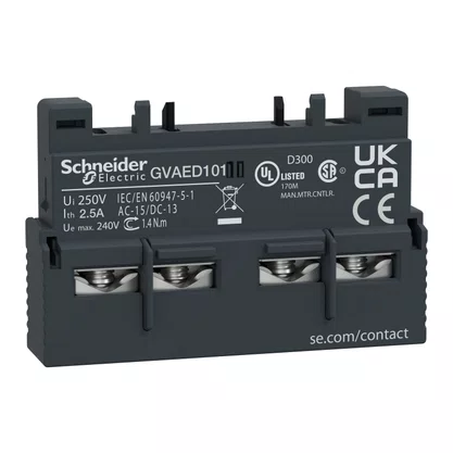 Bloco de contatos auxiliares TeSys Deca. para contatores LC1D. LC1F e relés de controle CAD.. Ele fornece contatos 2NA classificados até 10A 690V CA. faixa de configuração de atraso de 10-180s. Montagem frontal com clip. proporciona alta confiabilidade e durabilidade.. Certificação multipadrões (IEC. UL. CSA. CCC. EAC). compatível com Green Premium (RoHs/Reach).