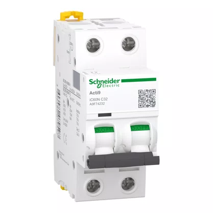 Os disjuntores Acti9 IC60 da Schneider Eletric são projetados para proteger o circuito elétrico contra sobrecargas e curtos-circuitos.. O A9F74232 possui 2 polos. corrente nominal de 32A. curva de atuação tipo C e capacidade de interrupção de 20kA em 220/240VCA (60947-2).. Este produto possui uma sinalização aparente de falha (Visitrip) e oferece uma vida útil maior ao produto graças a sua tecnologia única de fechamento rápido.