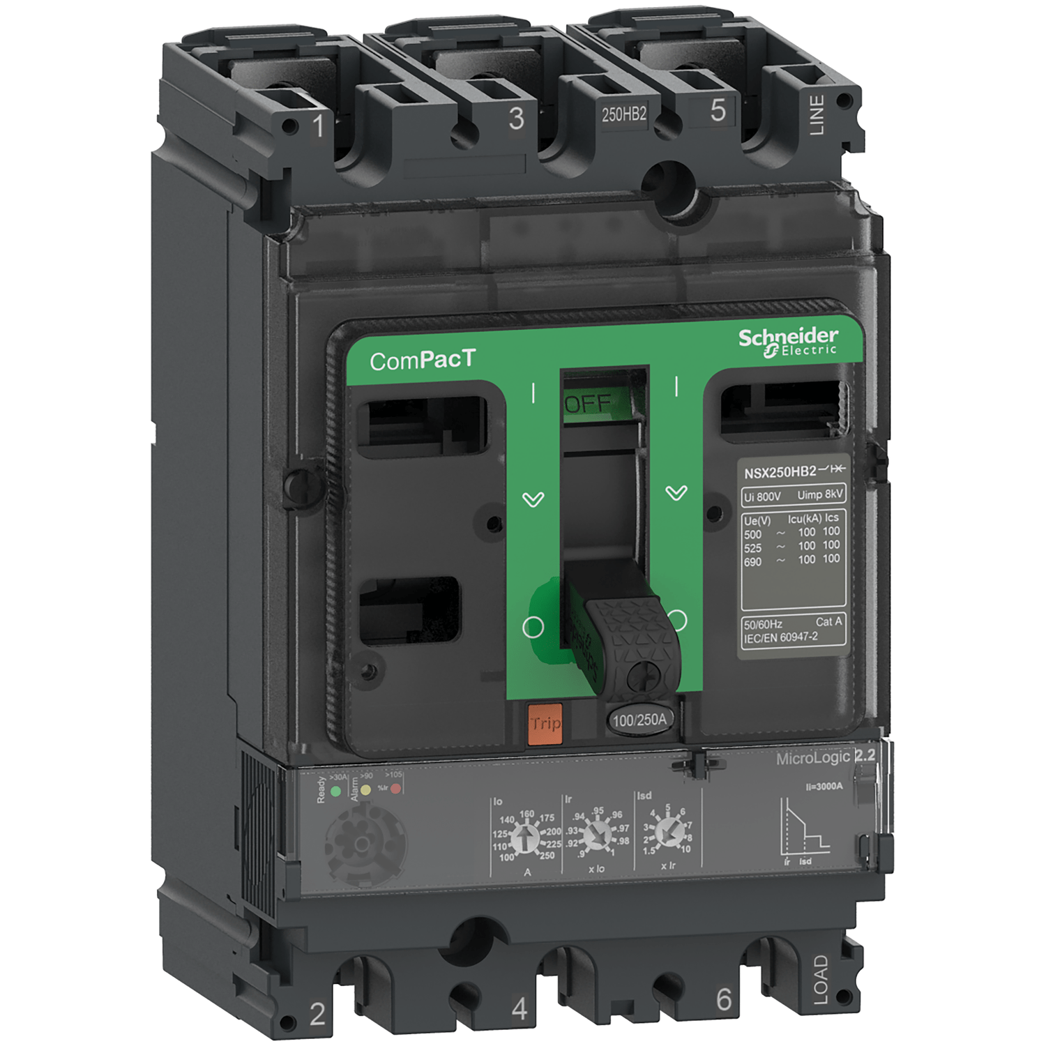 O ComPacT NSX250F é um disjuntor fixo 3P 3d completo. projetado para otimizar o espaço e a capacidade de interrupção.. É a escolha ideal para todas as aplicações padrão e específicas.. A capacidade de interrupção (Icu) é de 36 kA rms a 415 VCA 50/60Hz.. A tensão operacional é de 690 VCA 50/60 Hz.. Esse produto incorpora uma unidade de disparo eletrônica MicroLogic 2.2. com classificação de 250 A.. A unidade de disparo MicroLogic 2.2 oferece proteções ajustáveis de longa e curta duração. além de uma proteção instantânea fixa.. Esta versão de 3 polos (105 mm x 161 mm x 86 mm) vem com uma variedade de funções e acessórios opcionais.. Está em conformidade com os padrões internacionais (IEC 60947). CCC. EAC e especificações marítimas.. O ComPacT NSX250F faz parte da arquitetura EcoStruxure Power da Schneider Electric.