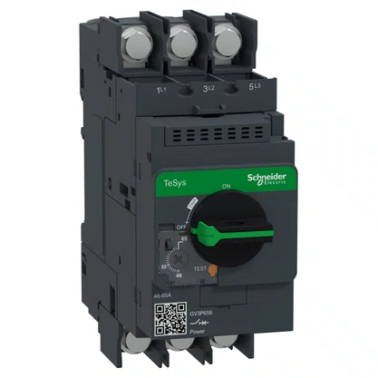 Os disjuntores motores Tesys Deca podem ser facilmente integrados em várias configurações. graças a sua largura padrão de 55 mm e montagem em trilho DIN.. Além de contar com acessórios de barramento completos para conexão rápida.. Este produto possui 3 polos. capacidade de 48-66A/690V e está destinado para aplicações de motor trifásico 30kW/400V.. Fornece uma proteção termomagnética com uma gama de regulação térmica 48-66A. disparo magnético a 14xIn e alta capacidade de ruptura Icu 100kA@400V.. Além disso. conta com proteção IP20 e conexão por meio de terminais de parafuso tipo olhal.. Também permite o controle de inicio/parada por manopla rotativa garantida por 50.000 ciclos AC-3.. Este produto tem certificação multipadrão (IEC. UL. CSA. CCC. EAC. Marine).. Os disjuntores motor Tesys Deca levam o selo Green PremiumTM. . que promete conformidade com as mais recentes regulamentações. transparência nos impactos ambientais. produtos circulares e de baixo CO2.