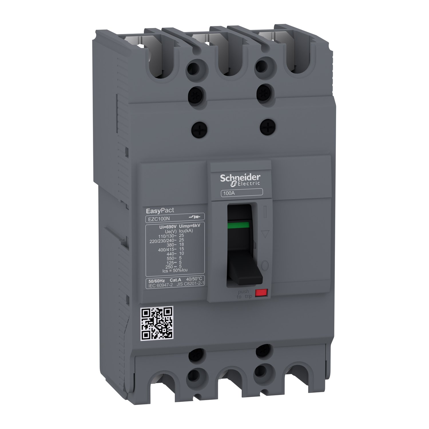 O EasyPact EZC100N é um disjuntor fixo de 3 polos projetado para a proteção de instalações elétricas de baixa tensão. É usado para aplicações padrão em indústrias e edifícios, oferecendo bom desempenho a preços competitivos A capacidade de interrupção (Icu) é de 15 kA rms a 415 VCA 50/60 Hz. A tensão operacional é de 550 VCA 50/60 Hz ou 250 VCC. A classificação da unidade de disparo termomagnético é 80A. A unidade de disparo fornece proteção contra sobrecarga fixa e proteção instantânea. Esta versão de 3 polos (75 mm x 130 mm x 60 mm) vem com uma variedade de funções e acessórios opcionais. O Easypact EZC100N está em conformidade com normas internacionais (IEC 60947, UL 508) e certificações marítimas.