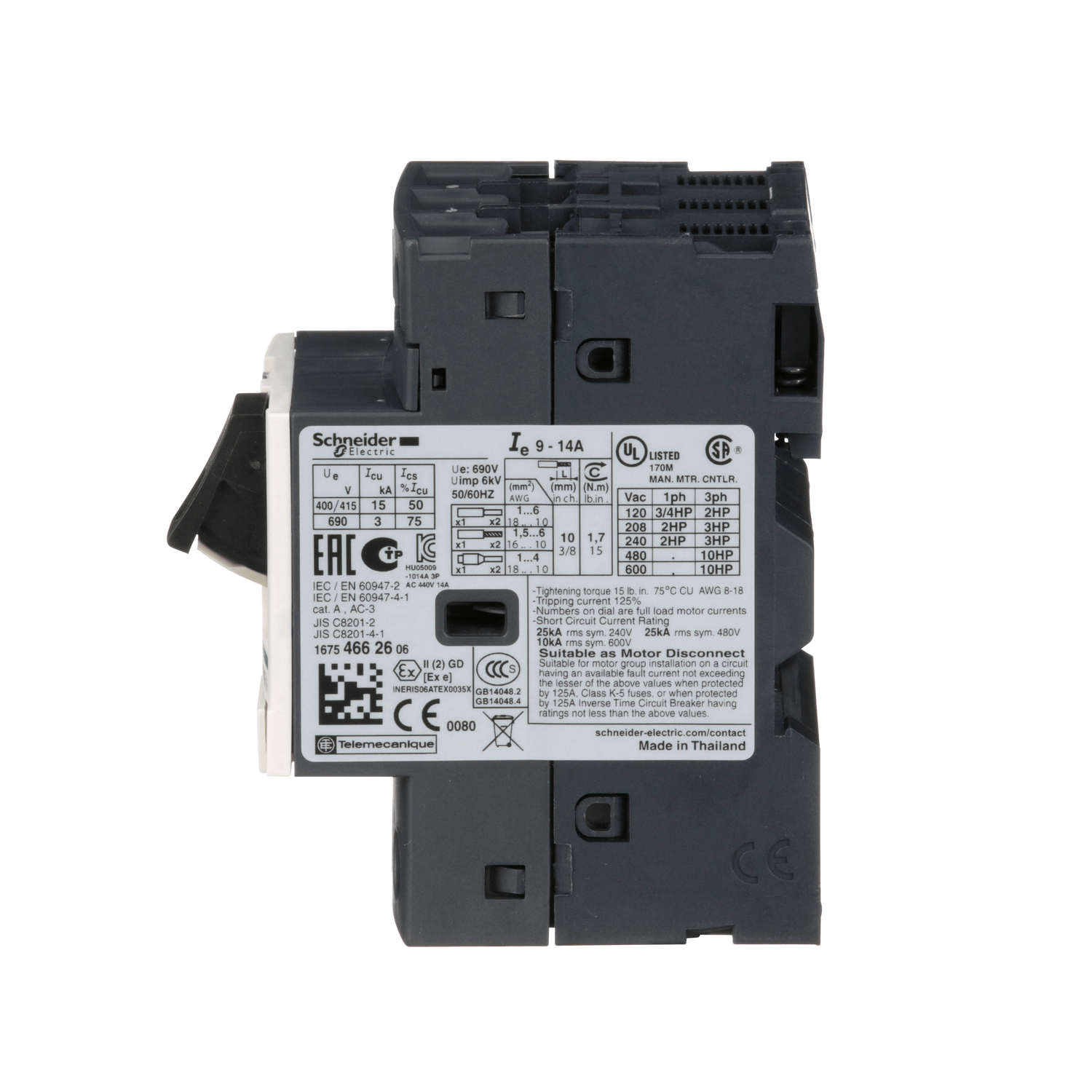 As novas gerações de disjuntores motores TeSys Deca - frame 2 oferecem uma solução completa para quase todas as aplicações. Ele fornece proteção contra curto-circuito, proteção contra sobrecarga e controle do motor (ON/OFF). Este produto possui 3 polos, capacidade de 9–14A/690V e está destinado para aplicações de motor trifásico 5,5kW/400V. Fornece uma proteção termomagnética com uma gama de regulação térmica 9–14A, disparo magnético a 9xIn e alta capacidade de ruptura Icu 15kA@400V. Além disso, conta com proteção IP20 e conexão por meio de terminais de parafuso. Também permite o controle de início/parada por botão de pressão garantido por 100.000 ciclos AC-3. Este produto tem certificação multipadrão (IEC, UL, CSA, CCC, EAC, Marine). Os disjuntores motor TeSys Deca levam o selo Green Premium™, que promete conformidade com as mais recentes regulamentações, transparência nos impactos ambientais, produtos circulares e de baixo CO₂. que promete conformidade com as mais recentes regulamentações, transparência nos impactos ambientais, produtos circulares e de baixo CO2.