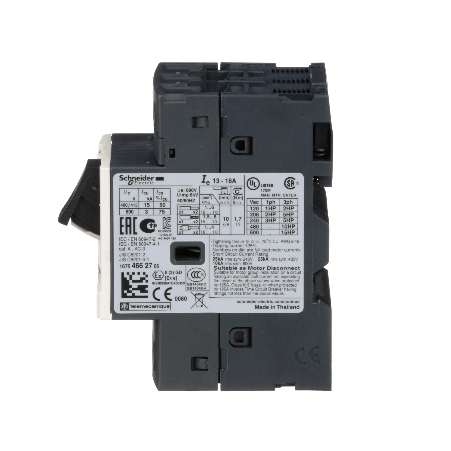 As novas gerações de disjuntores motores TeSys Deca - frame 2 oferecem uma solução completa para quase todas as aplicações. Ele fornece proteção contra curto-circuito, proteção contra sobrecarga e controle do motor (ON/OFF). Este produto possui 3 polos, capacidade de 13–18A/690V e está destinado para aplicações de motor trifásico 7,5kW/400V. Fornece uma proteção termomagnética com uma gama de regulação térmica 13–18A, disparo magnético a 9xIn e alta capacidade de ruptura Icu 15kA@400V. Além disso, conta com proteção IP20 e conexão por meio de terminais de parafuso. Também permite o controle de início/parada por botão de pressão garantido por 100.000 ciclos AC-3. Este produto tem certificação multipadrão (IEC, UL, CSA, CCC, EAC, Marine). Os disjuntores motor TeSys Deca levam o selo Green Premium™, que promete conformidade com as mais recentes regulamentações, transparência nos impactos ambientais, produtos circulares e de baixo CO₂. que promete conformidade com as mais recentes regulamentações, transparência nos impactos ambientais, produtos circulares e de baixo CO2.
