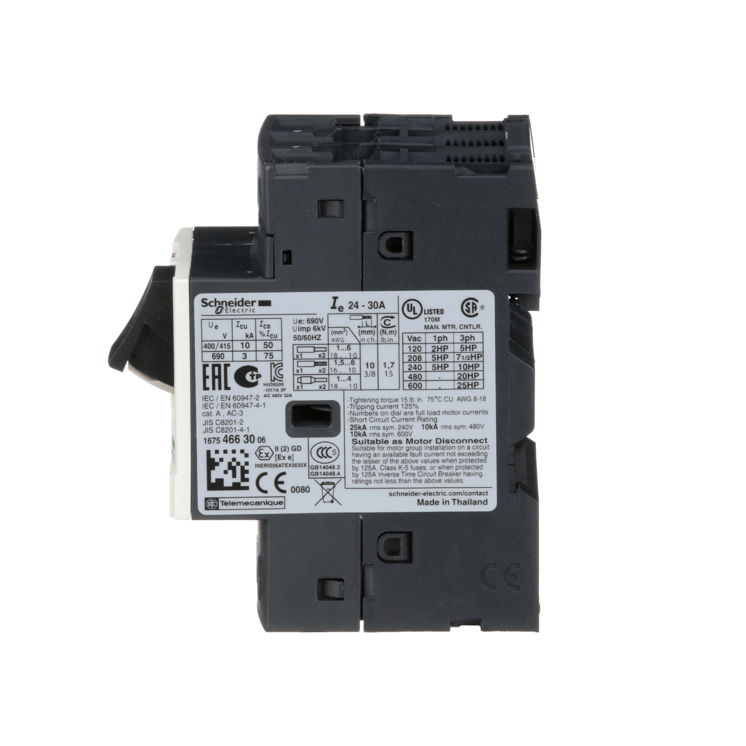 As novas gerações de disjuntores motores TeSys Deca – frame 2 oferecem uma solução completa para diversas aplicações. Proporcionam proteção contra curto-circuito, proteção contra sobrecarga e controle de motor (liga/desliga). Este modelo possui 3 polos, faixa de corrente de 24–32A a 690V, indicado para motores trifásicos de até 15kW a 400V. Oferece proteção termomagnética com ajuste térmico de 24–32A, disparo magnético a 9xIn e alta capacidade de interrupção Icu de 15kA a 400V. Conta com proteção IP20 e conexão por terminais de parafuso. Permite controle de partida/parada por botão de pressão, com durabilidade garantida de 100.000 ciclos AC-3. Certificado por múltiplas normas (IEC, UL, CSA, CCC, EAC, Marinha). Os disjuntores motor Tesys Deca levam o selo Green PremiumTM, que promete conformidade com as mais recentes regulamentações, transparência nos impactos ambientais, produtos circulares e de baixo CO2.