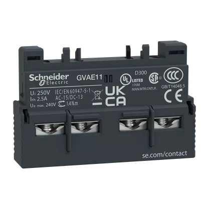 Bloco de contato auxiliar TeSys GV, para disjuntores motores GV2 e GV3.,Contatos auxiliares instantâneos 1NA+1NF.,Classificado para operação até 2A/240V CA e 1A/60V CC.,Para ser instalado na parte frontal do disjuntor, conexão por terminais de grampo de parafuso.,Vendido em lotes de 10 unidades.,Certificação multipadrões (IEC, UL, CSA, CCC, EAC), compatível com Green Premium (RoHS/REACh).