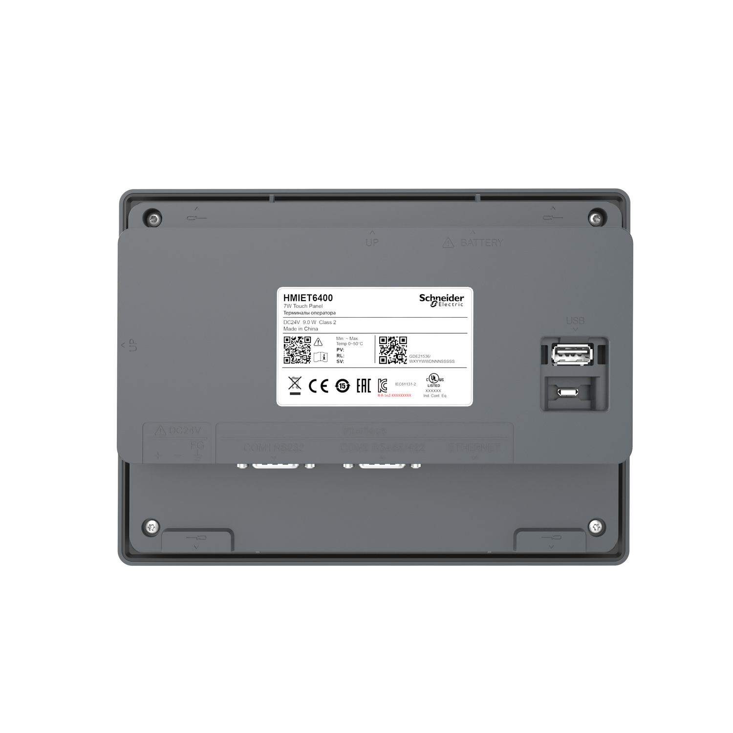 O HMIET6400 é um painel touchscreen essencial da linha Easy Harmony ET6 da Schneider Electric. Este painel HMI Ethernet resistivo de toque único possui alta resolução e mais cores. Esta interface HMI tem 7 polegadas de largura, 16 milhões de cores e resolução de 800 x 480 pixels (WVGA). É alimentado pelo software Vijeo Designer Basic para uma experiência intuitiva do usuário. Possui uma CPU ARM Cortex-A8 de 800 MHz, 256 MB de memória de sistema e aplicativo e 128 KB de memória não volátil. Este HMI ET6 suporta portas Ethernet, COM1 (RS-232C), COM2 (RS-422/485), 1 porta USB 2.0 Tipo A e 1 porta USB 2.0 Micro-B. Suas dimensões são 205,5 mm (largura) x 150,5 mm (altura) x 45 mm (profundidade) e pesa 0,60 kg. Destina-se a indústrias como embalagens, HVAC, bombas, eletrônicos, baterias, máquinas-ferramentas e usinagem de materiais, etc. Está em conformidade com normas como EN (61000-6-4, 61000-6-2, 61131-2), UL 61010-2-201, CSA C22.2 No 61010-2-201 e certificações como UL, CE, KC, EAC, China RoHS, REACH. Os acessórios de manutenção (parafuso de fixação de instalação, conector de alimentação, bateria, etc.) e opções externas (cabo de download USB, cabo de extensão USB, folha de proteção de tela, etc.) estão disponíveis com o HMI ET6. Ele foi projetado para montagem em painel por 4 ou 6 parafusos de fixação (a quantidade de parafusos depende do tamanho da tela). Esta linha foi projetada com tela de alta resolução, mais cores e capacidade Ethernet para permitir que os OEMs otimizem seu design e investimento em HMI. O grau de proteção é IP65F.