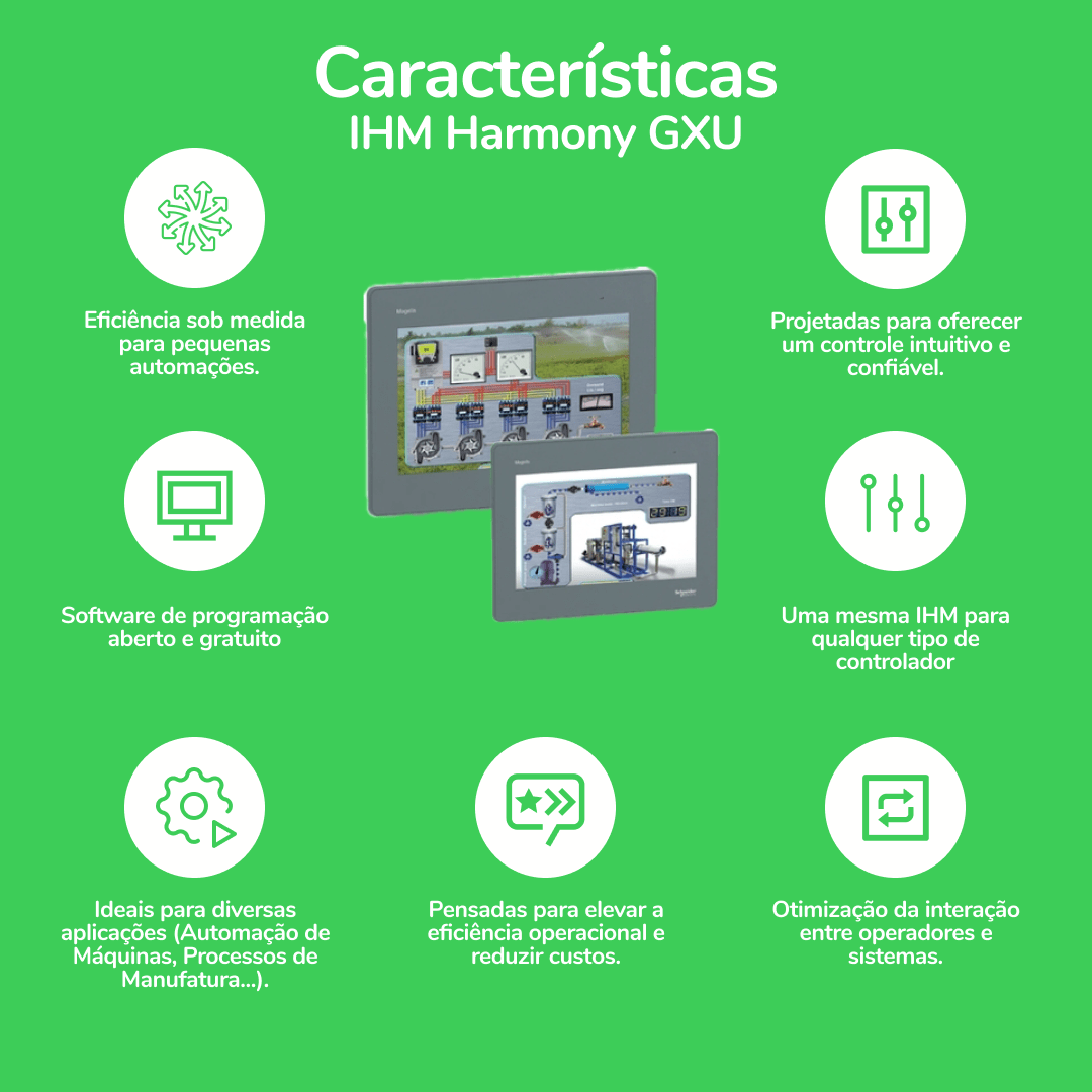 O Harmony Easy GXU é um painel tátil avançado, parte da linha de produtos Harmony Easy. Ele apresenta um display LCD de tela sensível ao toque com 65536 cores e uma resolução de 800 x 480 pixels WVGA, em um generoso tamanho de 7 polegadas. Com uma vida útil da luz de fundo de 20000 horas, é alimentado por uma tensão nominal de 24 V CC. O software de configuração associado é o Vijeo Designer Basic. Quanto à memória, possui 48 MB internos para aplicação, 128 MB DDR interno e 128 kB interno para backup. Em termos de conectividade, o painel oferece diversas opções integradas, como USB tipo mini B, conexão serial COM1 com conector SUB-D macho de 9 pinos para RS232C, ligação de série COM2 com conector SUB-D macho de 9 pinos para RS422/RS485, porta USB tipo A e Ethernet 10/100BASE-TX. O design do Harmony Easy GXU inclui dimensões de recorte de 190 x 135 mm. Quanto ao ambiente de operação, é projetado para suportar temperaturas de 0 a 50 °C, enquanto as condições de armazenamento podem variar de -20 a 60 °C. Possui um grau de proteção IP65 para o painel frontal, indicando sua resistência a poeira e jatos d'água. O produto é marcado com a etiqueta CE, atestando sua conformidade com os padrões de qualidade.