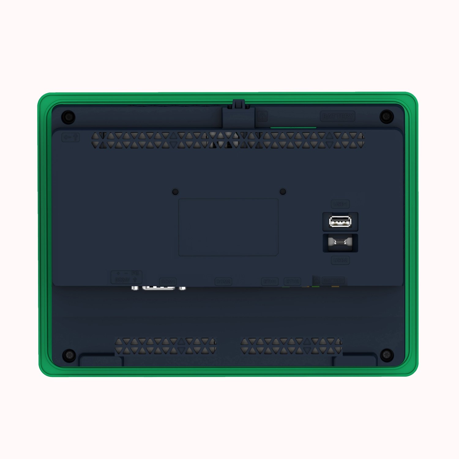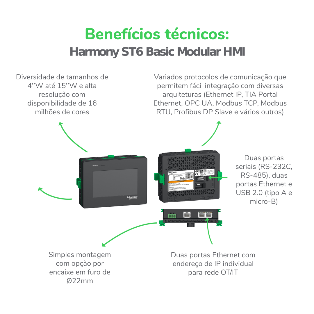 Apresentamos a HMIST6500, uma tela tátil da linha de produtos Harmonia ST6, projetada para oferecer uma experiência intuitiva e eficiente de controle e monitoramento. Com um design elegante e recursos avançados, esta tela tátil é ideal para aplicações industriais exigentes.O HMIST6500 é equipado com um processador ARM Cortex-A8, garantindo um desempenho rápido e confiável. Sua tela TFT LCD colorida de 10 polegadas oferece uma exibição vívida e nítida, com suporte para 16 milhões de cores. Com uma resolução de 1024 x 600 pixels WSVGA, você desfrutará de imagens nítidas e detalhadas em todas as suas aplicações. Com uma tensão nominal de fornecimento de 24 VCC (+/- 20%) e uma corrente de irrupção de 30A, o HMIST6500 é projetado para oferecer um desempenho confiável e estável em sua operação. Seus LEDs de status fornecem uma indicação visual clara do status do dispositivo, desde o modo offline até o operativo, standby e alimentação. O consumo de energia é de 12,6 W, o que garante uma operação eficiente em termos energéticos. Com capacidade para até 200 páginas de aplicativo, você terá espaço suficiente para criar e personalizar suas telas e aplicações conforme necessário. A HMIST6500 vem com o pacote de software EcoStruxure Expert em Terminal de Operador, oferecendo recursos avançados de programação e configuração para atender às suas necessidades específicas. Com uma frequência de processador de 800 MHz e uma porta Ethernet 10/100BASE, você pode desfrutar de uma conectividade rápida e confiável para integração em sua infraestrutura de rede. As opções de conexão incluem uma conexão serial COM1, uma ligação serial COM2 (RS232C e RS485) e duas portas USB 2.0, fornecendo flexibilidade para conectar dispositivos externos e periféricos.