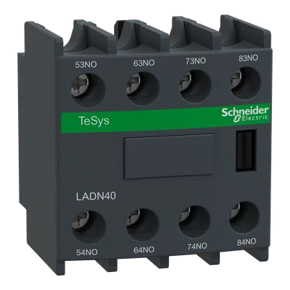 Bloco de contatos auxiliares instantâneos TeSys D, para contatores LC1D, LC1F e relés de controle CAD.,Ele fornece contatos 4NO (certificado de espelho NC) com capacidade de até 10A/690V CA, conexão por terminais de grampo de parafuso.,Montagem frontal com clip, proporciona alta confiabilidade e durabilidade.,Este produto tem certificação multipadrão (IEC, UL, CSA, CCC, EAC).,O bloco de contato auxiliar Tesys Deca leva o selo Green PremiumTM,,que promete conformidade com as mais recentes regulamentações, transparência nos impactos ambientais, produtos circulares e de baixo CO2.