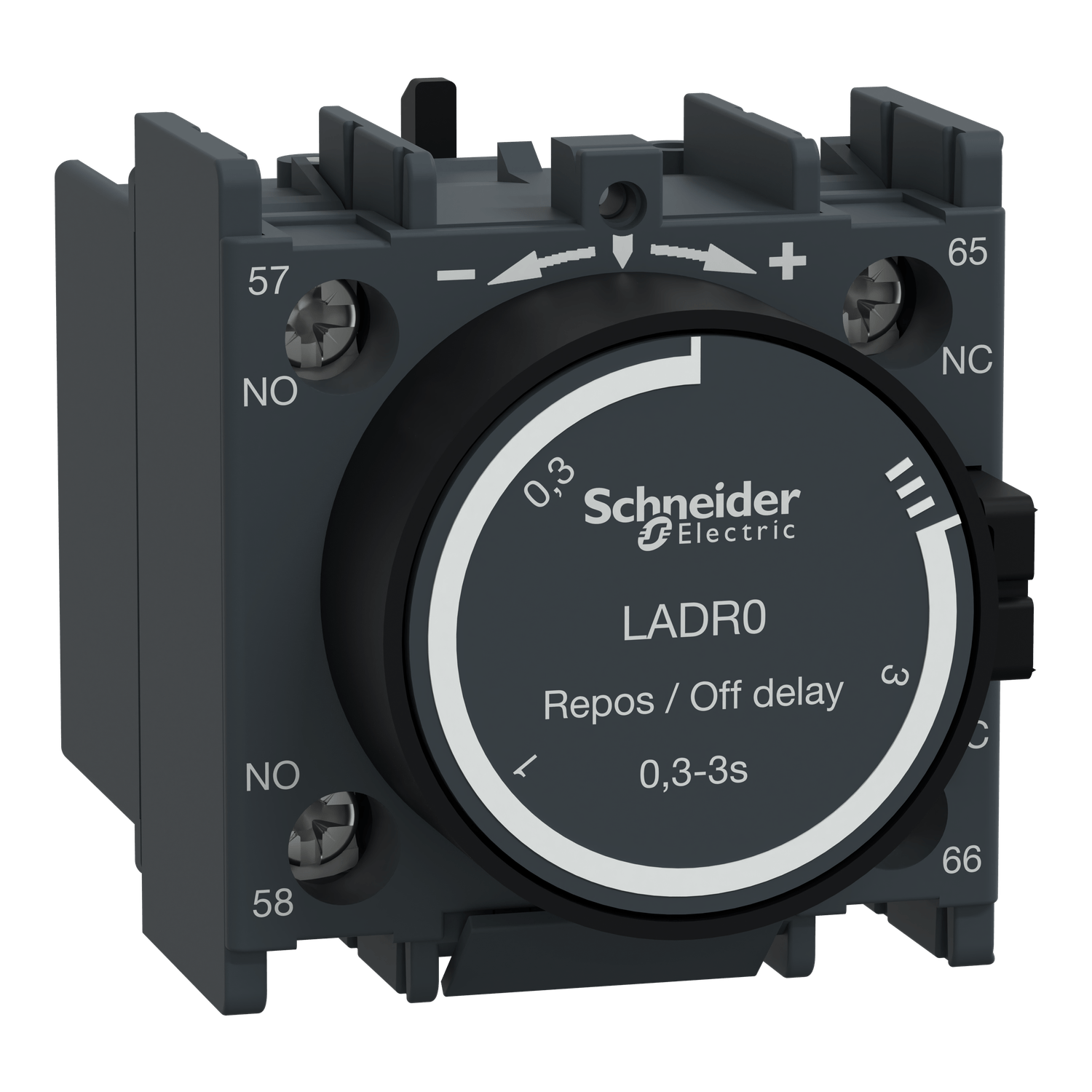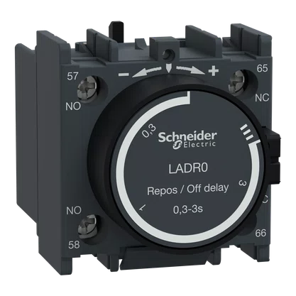 Bloco de contato auxiliar de retardo de tempo Tesys Deca para contator TeSys D e TeSys F.Bloco de montagem frontal, o qual fornece contatos 1NA+1NF classificados até 10A/690V CA, com uma faixa de configuração de atraso de desligamento de 0,1-3s e conexão por terminais de grampo de parafuso.Montagem frontal por encaixe, proporciona alta confiabilidade e durabilidade.Este produto tem certificação multipadrão (IEC, UL, CSA, CCC, EAC).O bloco de contato auxiliar de retardo de tempo Tesys Deca leva o selo Green PremiumTM,,que promete conformidade com as mais recentes regulamentações, transparência nos impactos ambientais, produtos circulares e de baixo CO2.