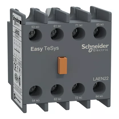 Bloco de contato auxiliar adicional para contatores EasyPact TVS LC1E. Fornece contatos instantâneos 2NA+2NF classificados até 10A 690V CA, conectados por terminais de grampos de parafuso. Ele pode ser usado em aplicações de segurança graças aos seus contatos espelhados com certificação NC. Fácil de montar na frente por clip-on, proporciona alta confiabilidade e durabilidade. Disponível em todo o mundo, é certificado por vários padrões (IEC, UL, CSA, CCC, EAC, Marine) e leva o selo Environmental Data Program, que categoriza e mede os atributos ambientais e a pegada ecológica/de carbono do produto, com o objetivo de proporcionar dados transparentes e robustos que cobrem todo o ciclo de vida do produto.