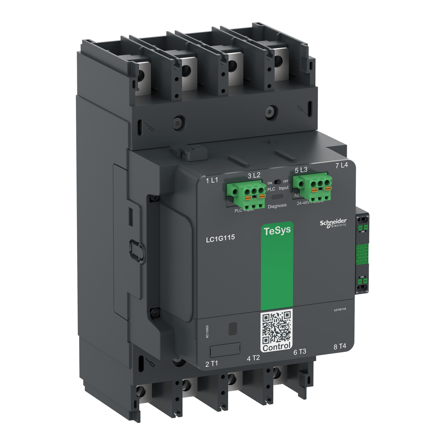 Contator de alta potência TeSys Giga, 4 pólos (4 NA) adequado para aplicações de categoria AC-1 até 250A @ 440V.É equipado com bobina eletrônica de baixo consumo de banda larga de 200-500V CA/CC, controle de saída PLC e incorporado com bloco de contato auxiliar 1NA+1NF altamente confiável (17V 1mA).Projetado para aplicações exigentes com taxas de operação máximas de até 300 ciclos por hora e ambientes de até 60°C.É construído com alta confiabilidade, proporcionando durabilidade mecânica de até 8 milhões de ciclos.O diagnóstico de desgaste de contato (CWD) é uma função padrão, que monitora continuamente e fornece feedback através de condições saudáveis e de alarme por um indicador LED,A sinalização remota do diagnóstico de desgaste é habilitada por um módulo opcional de Diagnóstico Remoto de Desgaste (RWD).É possível substituir o módulo de comutação (contatos principais) e o módulo de controle.É possível aumentar a vida útil e a manutenção do contator sem remover os cabos/barras principais de alimentação, graças aos blocos de conexão com memória de cabo.As conexões de alimentação principais acessíveis pela frente são com conexão aparafusada e conexões de controle por terminais push-in e montagem fácil e rápida.Ele fornece proteção IP2x da face frontal com coberturas de terminal opcionais em conformidade com IEC 60529 e VDE 0106.Ele pode cobrir -25°C a 60°C de temperatura do ar ambiente de operação e montado diretamente na placa, sem desclassificação até 3000m de altitude.O contator pode ser instalado em três quadrantes do plano vertical e o relé de sobrecarga pode ser montado diretamente abaixo do contator.As dimensões são 255 mm x 143 mm x 193 mm (A x L x P), o tamanho compacto permite economia de espaço no painel.Certificação multipadrões (marcação CB, CCC, cULcs, CE, UKCA) e compatível com Green Premium (RoHs/Reach).O QR code exclusivo fornece acesso rápido a dados completos do produto.