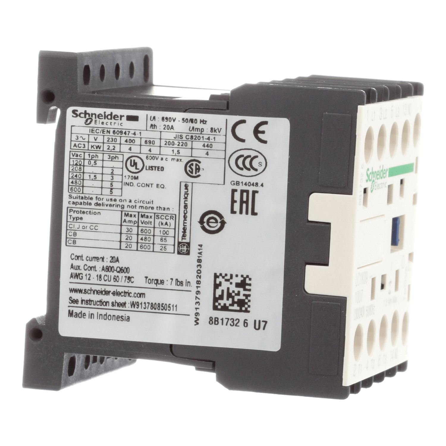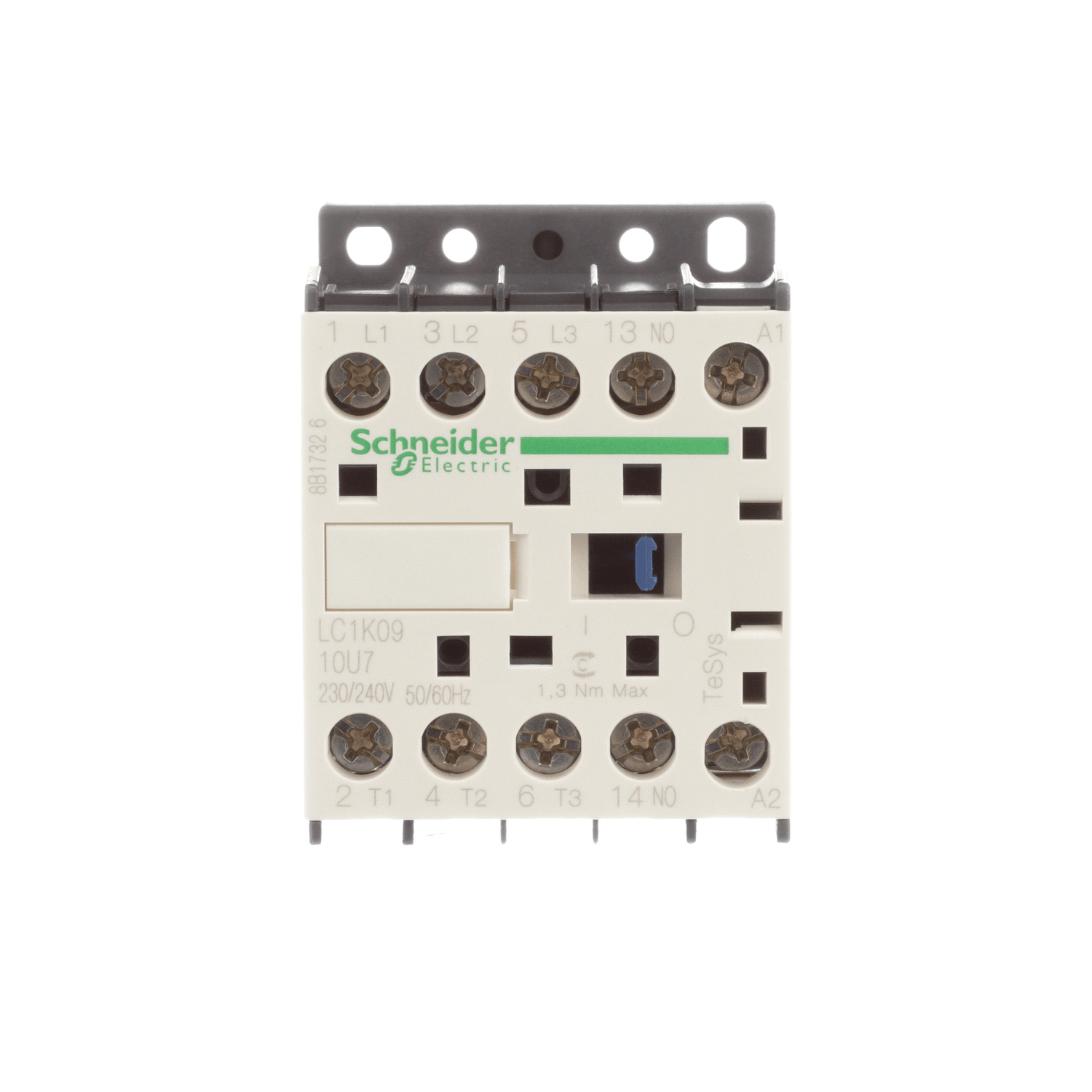 Contator TeSys K, 3 polos (3NA), para aplicações de controle de motores até 9A/690V AC-3 (4kW@400V),,e para aplicações de controle de carga não indutiva até 20A/690V AC-1.Fornece uma bobina de 230-240V 50/60Hz CA, contato auxiliar embutido 1NA, conexão por terminais de grampo de parafuso.Para taxas de operação de até 600 ciclos/hora e ambientes de até 50°C, proporciona confiabilidade e durabilidade para aplicações padrão.Muito compacto (largura de 45 mm), montagem em trilho DIN ou fixação por parafuso.Certificação multipadrões (IEC, UL, CSA, CCC, EAC), compatível com Green Premium (RoHS/REACh).