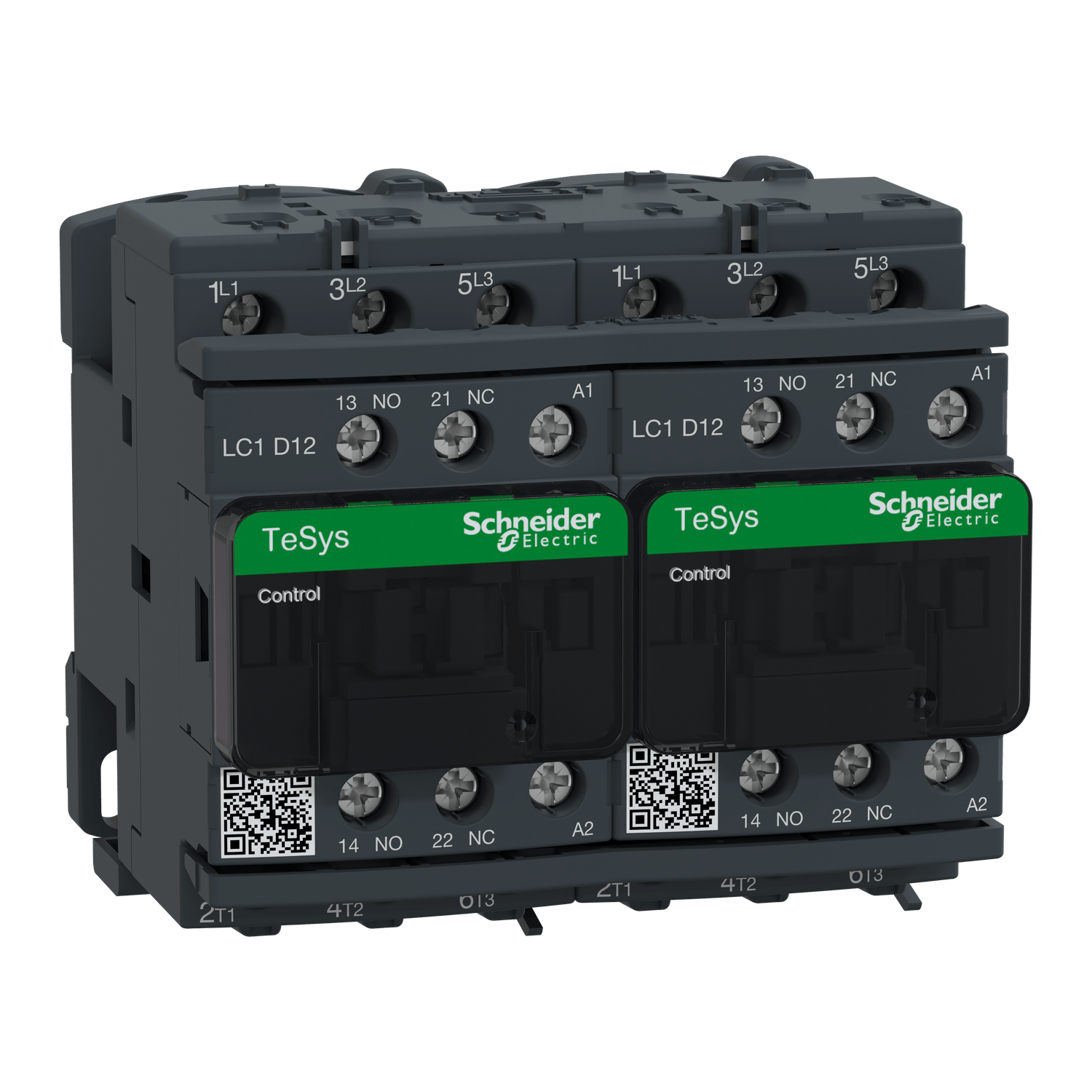 Contator reversor TeSys Deca, 3 polos (3NA), para aplicações de controle de motores até 12A/690V AC-3 (5,5kW@400V).Fornece bobinas de 110V 50/60Hz CA, contatos auxiliares embutidos 2NA+2NF (certificado espelho NF), conexão por terminais de grampo de parafuso.Para taxas de operação de até 3600 ciclos/hora e ambientes de até 60°C, adquire alta confiabilidade e durabilidade.Compacto (largura de 90 mm), montagem em trilho DIN ou fixação por parafuso.Com conexões de potência reversa pré-cabeadas, intertravamento mecânico (sem intertravamento elétrico).Certificação multipadrões (IEC, UL, CSA, CCC, EAC, Marine), compatível com Green Premium (RoHS/REACh).