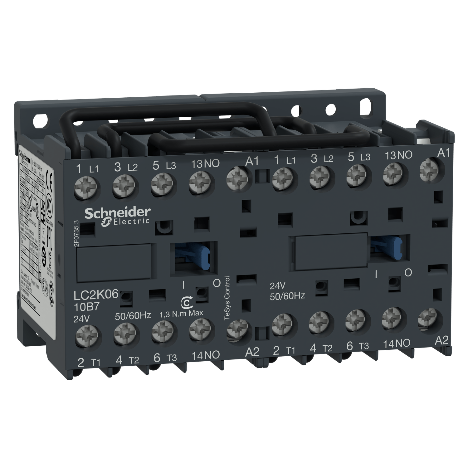 Contator de reversão TeSys K, 3 polos (3NA), para aplicações de controle de motores até 6A/690V AC-3 (2,2kW@400V).Fornece bobinas de 220V 50/60Hz CA, contatos auxiliares embutidos 2NA, conexão por terminais de grampo de parafuso.Para taxas de operação de até 600 ciclos/hora em AC-3 e ambientes de até 50°C, proporciona confiabilidade e durabilidade para aplicações padrão.Compacto (largura de 90 mm), montagem em trilho DIN ou fixação por parafuso.Com conexões de potência reversa pré-cabeadas, intertravamento mecânico (sem intertravamento elétrico).Certificação multipadrões (IEC, UL, CSA, CCC, EAC), compatível com Green Premium (RoHS/REACh).