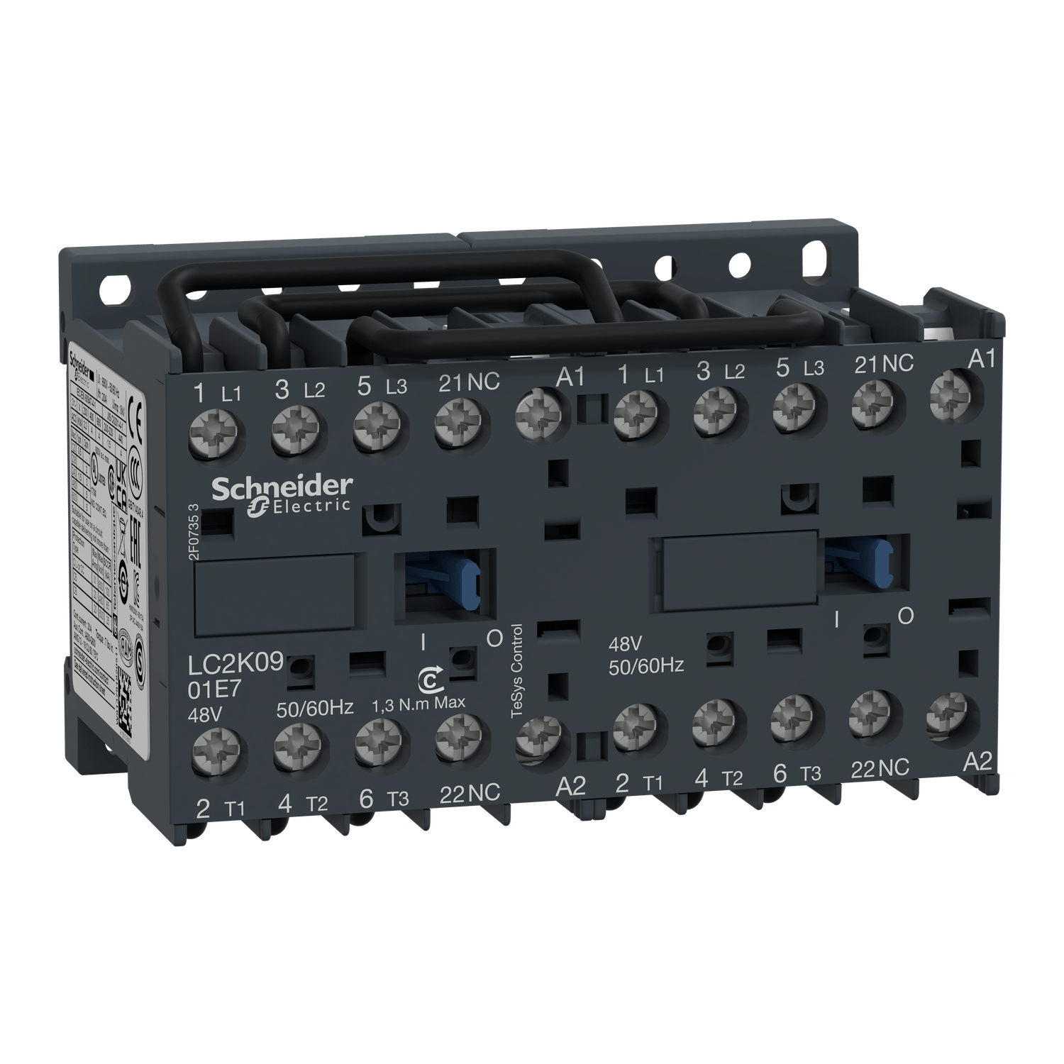 Contator de reversão TeSys K, 3 polos (3NA), para aplicações de controle de motores até 9A/690V AC-3 (4kW@400V).Fornece bobinas de 24V 50/60Hz CA, contatos auxiliares embutidos 2NF, conexão por terminais de grampo de parafuso.Para taxas de operação de até 600 ciclos/hora em AC-3 e ambientes de até 50°C, proporciona confiabilidade e durabilidade para aplicações padrão.Compacto (largura de 90 mm), montagem em trilho DIN ou fixação por parafuso.Com conexões de potência reversa pré-cabeadas, intertravamento mecânico (sem intertravamento elétrico).Certificação multipadrões (IEC, UL, CSA, CCC, EAC), compatível com Green Premium (RoHS/REACh).