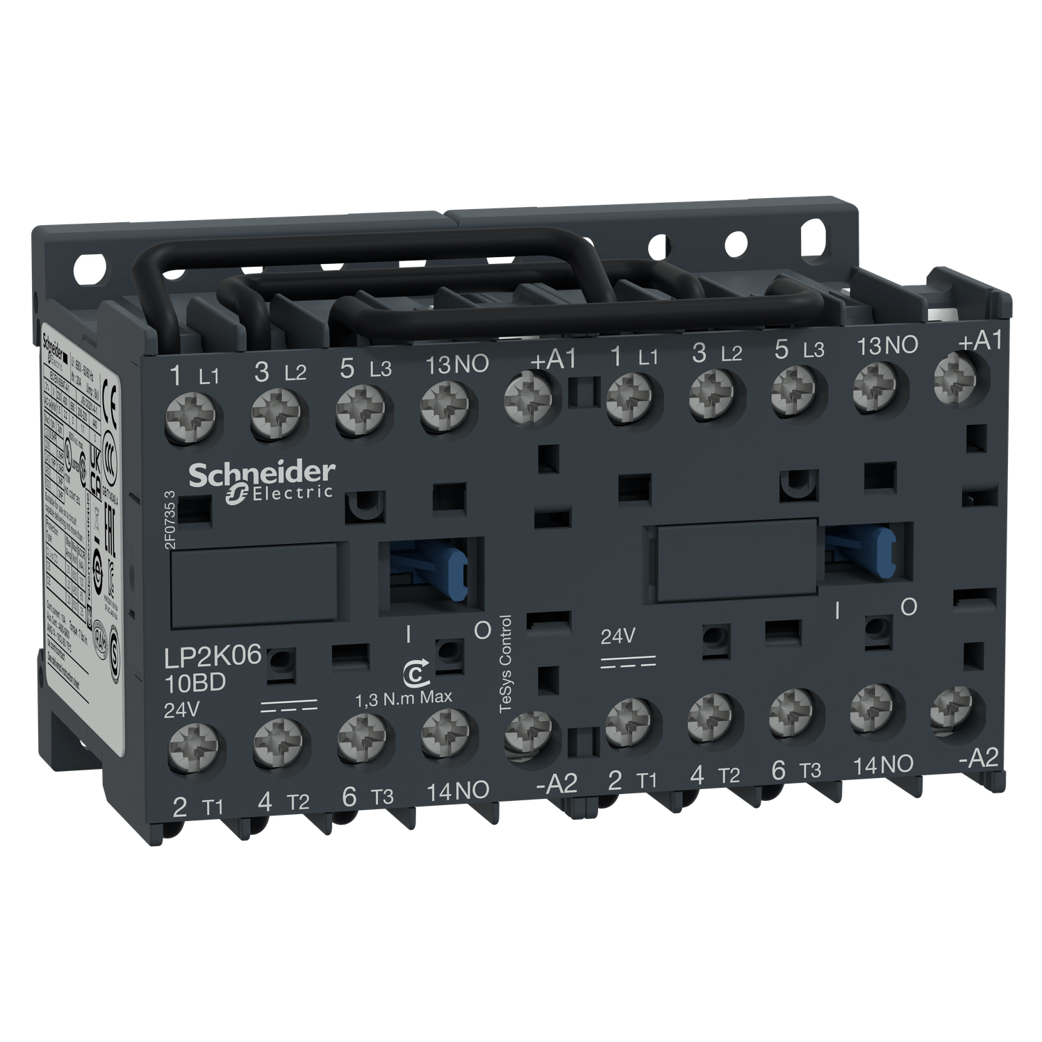 Contator de reversão TeSys K, 3 polos (3NA), para aplicações de controle de motores até 6A/690V AC-3 (2,2kW@400V).Fornece bobinas de 24V CC, contatos auxiliares embutidos 2NA, conexão por terminais de grampo de parafuso.Para taxas de operação de até 600 ciclos/hora em AC-3 e ambientes de até 50°C, proporciona confiabilidade e durabilidade para aplicações padrão.Compacto (largura de 90 mm), montagem em trilho DIN ou fixação por parafuso.Com conexões de potência reversa pré-cabeadas, intertravamento mecânico (sem intertravamento elétrico).Certificação multipadrões (IEC, UL, CSA, CCC, EAC), compatível com Green Premium (RoHS/REACh).
