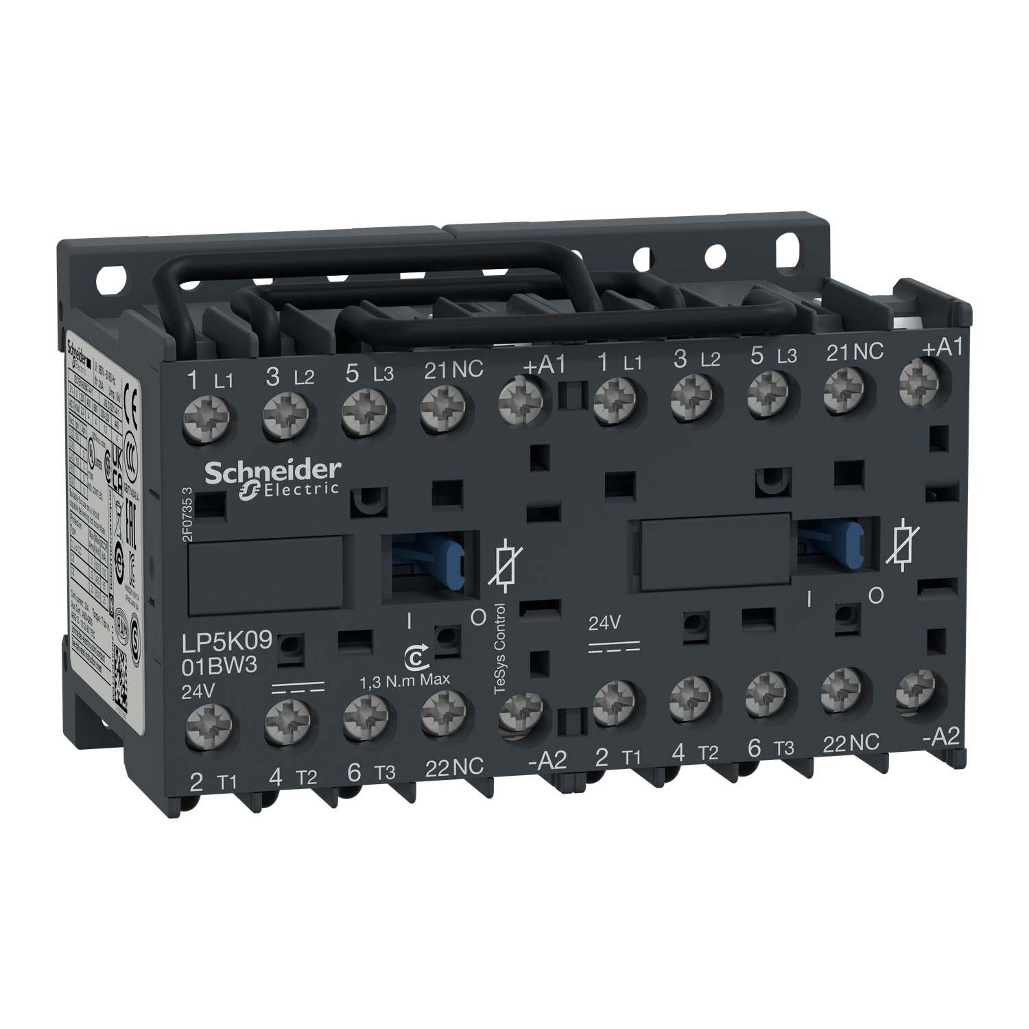 Contator de reversão TeSys K, 3 polos (3NA), para aplicações de controle de motores até 9A/690V AC-3 (4kW@400V).Fornece bobinas de 24V CC de baixo consumo com módulo supressor de transientes, contatos auxiliares embutidos 2NF, conexão por terminais de grampo de parafuso.Para taxas de operação de até 600 ciclos/hora em AC-3 e ambientes de até 50°C, proporciona confiabilidade e durabilidade para aplicações padrão.Compacto (largura de 90 mm), montagem em trilho DIN ou fixação por parafuso.Com conexões de potência reversa pré-cabeadas, intertravamento mecânico (sem intertravamento elétrico).Certificação multipadrões (IEC, UL, CSA, CCC, EAC), compatível com Green Premium (RoHS/REACh).