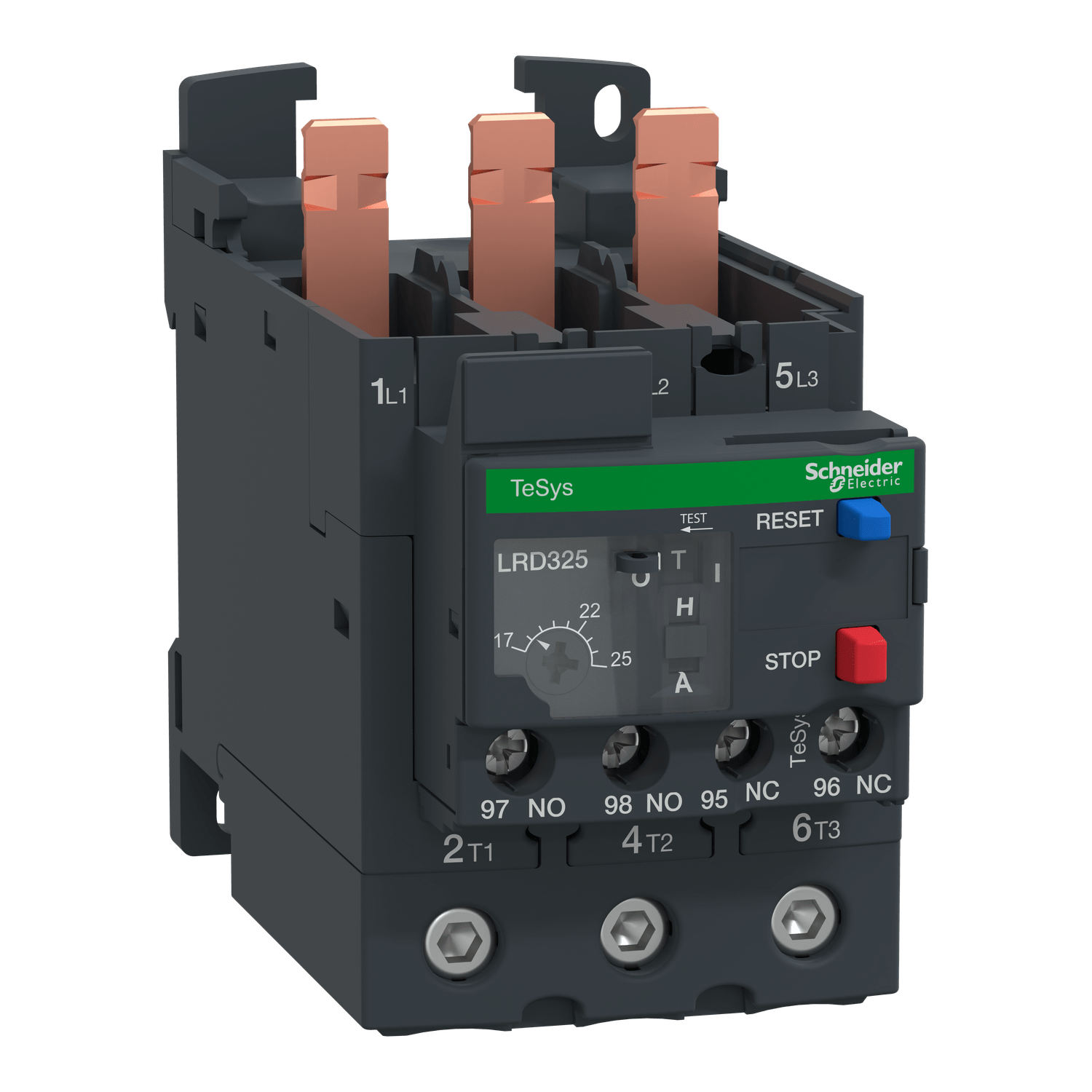 Os relés Tesys Deca foram projetados para as linhas de contatores Tesys Deca demonstrando uma proteção segura e eficaz.Este produto possui uma faixa de ajuste térmico de 17-25A/690V, classe de disparo 10A e está destinado para a proteção de motores trifásicos com menos de 11kW/400V.Este relé é um dispositivo diferencial com falha de fase (perda).Ele fornece um dial de ajuste térmico, um seletor de reset manual-automático, um botão de teste para simulação de disparo, botões de reset e parada, um indicador de alerta e dois contatos auxiliares (1NA+1NF) para sinalização de falha,As configurações são protegidas por uma tampa transparente que pode ser trancada por selagem.Sua conexão é por meio de terminais de parafuso EverLink BTR, conecta-se diretamente aos terminais inferiores dos contatores 3 polos LC1D40A-D80A, ou separado do contator, com uso de um bloco de terminais LAD96560 (a ser encomendado separadamente).Pode ser montado em riel DIN ou fixação por parafuso.Este produto tem certificação multipadrão (IEC, UL, CSA, CCC, EAC, Marine).Os reles de sobrecarga Tesys Deca levam o selo Green PremiumTM,,que promete conformidade com as mais recentes regulamentações, transparência nos impactos ambientais, produtos circulares e de baixo CO2.