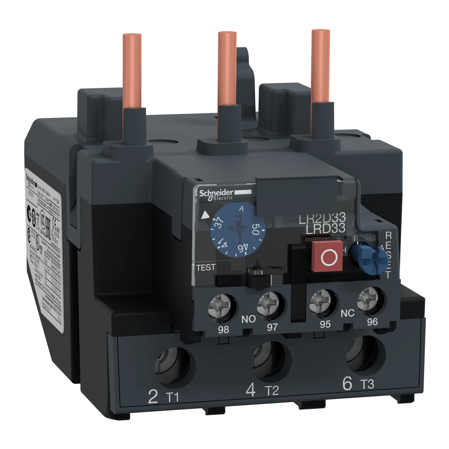 Relé de sobrecarga térmica TeSys LRD, 50A/1000V, faixa de ajuste térmico 37-50A, classe de disparo 10A, para proteção de motores trifásicos 22kW@400V.Dispositivo diferencial com falha de fase (perda).Ele fornece um indicador de ajuste térmico, um seletor de reset manual-automático atuando também como botão de reset,,um botão de teste de disparo para simulação de um disparo, um botão de parada, um indicador de sinalizador e 2 contatos auxiliares 1NA+1NF para sinalização de falha.As configurações são protegidas por uma tampa transparente bloqueável por vedação.Conexão por bornes de parafuso, conecta-se diretamente aos terminais inferiores dos contatores 3 polos LC1D80-D95.Montagem em trilho DIN ou fixação por parafuso, separado do contator, com uso de borne LA7D3064 (a ser pedido separadamente).Certificação multipadrões (IEC, UL, CSA, CCC, EAC, ATEX, Marine), compatível com Green Premium (RoHs/Reach).