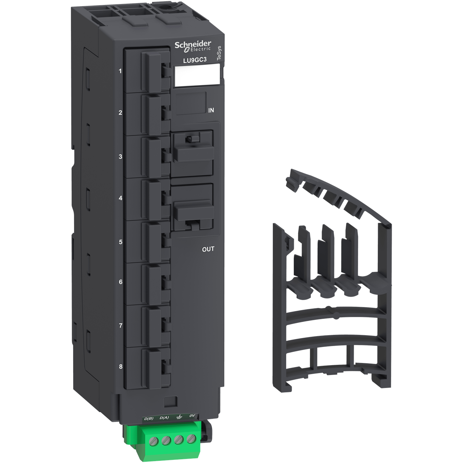 Divisor de comunicação TeSys U Modbus com 10 conectores RJ45 e 1 bloco de terminais de parafuso.Na parte frontal, fornece 8 x conectores RJ45 para derivação e 2 x conectores RJ45 para ligação em série.Na parte inferior, fornece um bloco terminal de parafuso de 4 pontos para conexão do cabo tronco Modbus.Para ser fixado em trilho DIN 35mm ou fixado por 2 parafusos no painel.Compatível com Green Premium (RoHS/REACH).