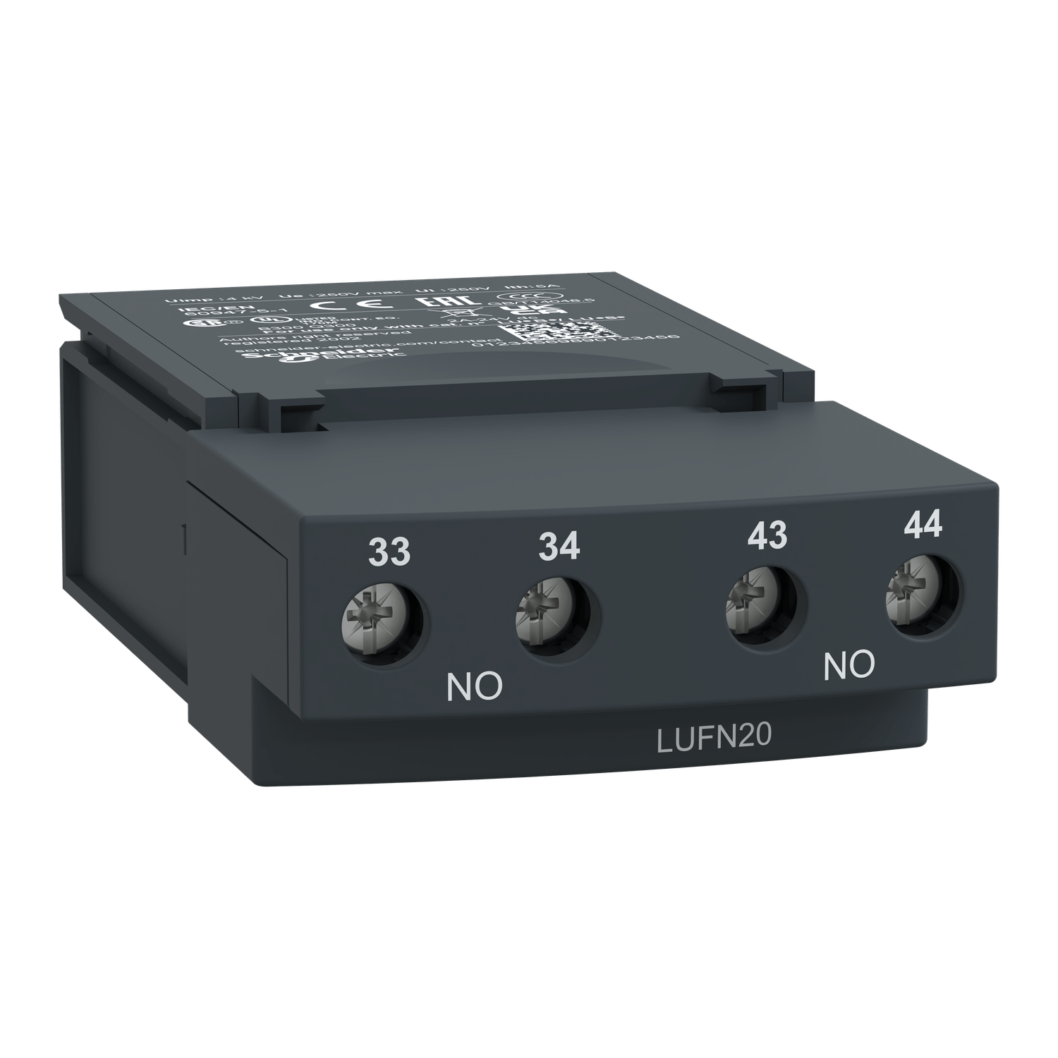 Módulo de contatos de sinalização auxiliar TeSys U para ser inserido em bases de potência padrão LUB12, LUB32, LUB38 ou base de potência avançada LUB120, LUB320, LUB380.Indica o estado de funcionamento ON/OFF do motor, qualquer que seja o sentido de rotação.Ele fornece contatos auxiliares instantâneos 2NA classificados como 24-250V CA/CC 5A máx.É alimentado pela unidade de controle.Para ser inserido na cavidade de uma base de alimentação prevista para os módulos auxiliares.Certificado quando usado em conjunto com uma base de potência LUB (IEC, UL, CSA, CCC, EAC, Marine), compatível com Green Premium (RoHS/REACh).