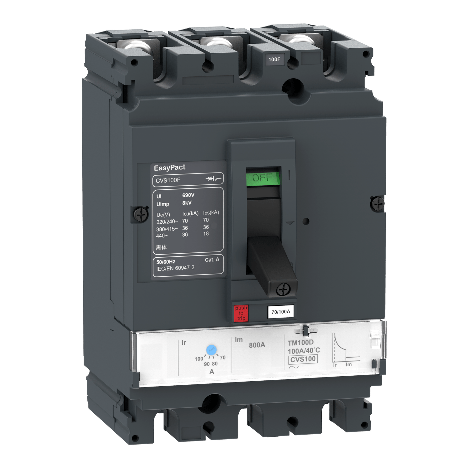 O EasyPact CVS100F é um interruptor, ou disjuntor, termomagnético fixo 3d de 3 polos com alto nível de desempenho e funcionalidade econômica.É uma escolha ideal para aplicações de proteção de edifícios pequenos e médios.A capacidade de ruptura (Icu) é de 36kA rms a 415VAC 50/60Hz.A tensão de operação é de 440 VAC 50/60 Hz.Este disjuntor inclui uma unidade de disparo TMD nominal de 100A.A unidade de desconexão TMD fornece proteção de sobrecarga térmica ajustável e proteção magnética fixa.Esta versão de 3 polos com dimensões de 105 mm (L) x 161 mm (A) x 86 mm (P) inclui uma variedade de recursos e acessórios opcionais.Além disso, pode ser instalado em painéis de interruptores de isolação de classe II, pois é um dispositivo frontal de classe II (IEC 60664-1).Este produto está em conformidade com as normas internacionais (IEC 60947, CCC, EAC).Os disjuntores termomagnéticos Easypact CVS levam o selo Green PremiumTM,,que promete conformidade com as mais recentes regulamentações, transparência nos impactos ambientais, produtos circulares e de baixo CO2.