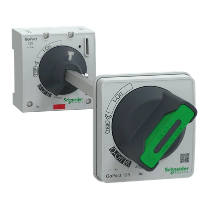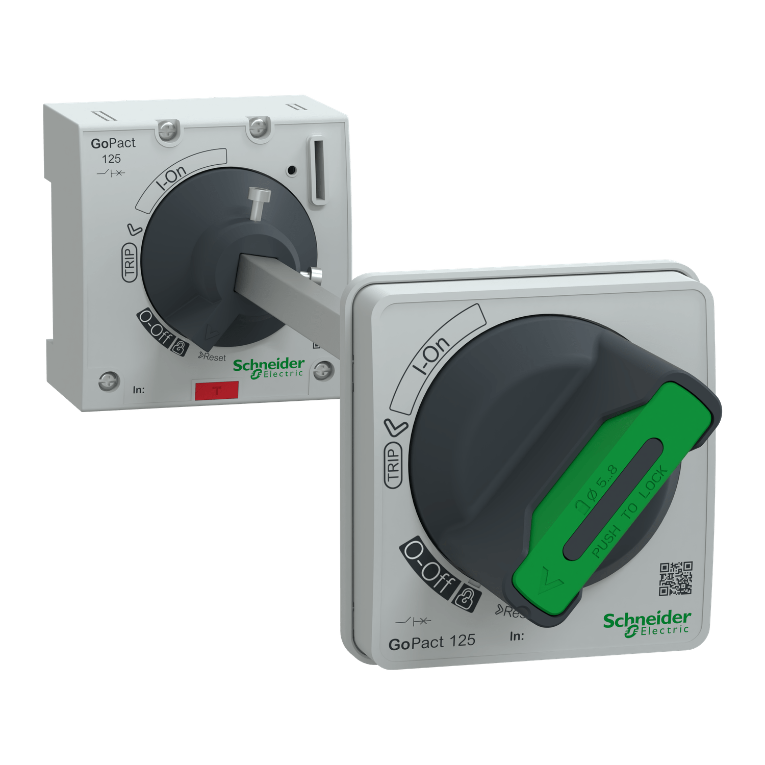 O GoPact de Schneider Electric é uma linha de disjuntores de caixa moldada especialmente projetada e dedicada a edifícios de pequeno e médio porte. fábricas. OEMs e outras aplicações exigentes.. É uma solução simples com qualidade robusta e preço acessível. Projetada para atender aos requisitos das instalações de sistemas elétricos atuais em constante evolução.. Este acessório é uma manopla rotativa estendida para o novo GoPact MCCB 125 e é instalada na face frontal dos dispositivos GoPact MCCB.. O GoPact MCCB oferece uma boa relação preço-desempenho para aplicações básicas e garantiza uma proteção elétrica confiável para suas aplicações.. Esta versão estendida possibilita a operação de dispositivos instalados na parte traseira dos quadros de distribuição. a partir do painel frontal do quadro de distribuição.. O comprimento do eixo é de 250 mm e o grau de proteção do disjuntor equipado com essa manopla rotativa estendida é IP54.. Esta manopla rotativa pode ser trancada com cadeado na posição OFF. usando de 1 a 3 cadeados não fornecidos (diâmetro da argola de 5 a 8 mm).. A cor do base é cinza (RAL 7035) e a cor da manopla é cinza escuro (RAL 7016).. O GoPact MCCB 125 é certificado pela IEC 60947-1 e IEC 60947-2. Além disso. a linha GoPact MCCB se beneficia da garantia de qualidade da Schneider Electric.. Os acessórios GoPact levam o selo Green PremiumTM. . que reflete o compromisso e a conformidade com as mais recentes regulamentações ambientais. a transparência sobre os impactos ambientais e os produtos circulares ede baixo CO2.