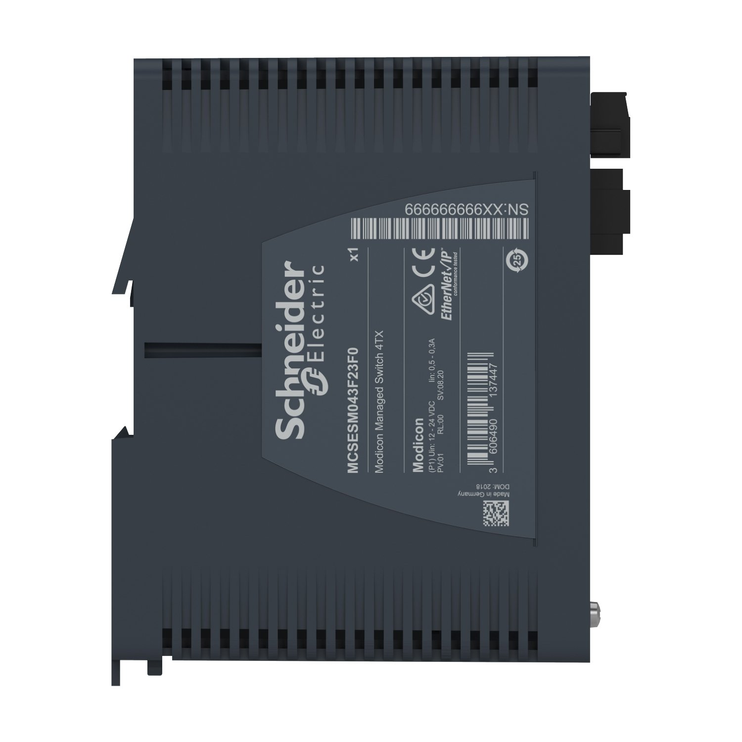 Apresentamos o Modicon Ethernet TCP/IP, um interruptor gerenciado que oferece conectividade avançada para redes industriais. Com suporte a diversos protocolos de comunicação, como TCP/IP Ethernet, SSH, HTTP, HTTPS, SNMP, RS232, SFTP, SCP, LLDP, Telnet e SNTP, esse interruptor garante uma comunicação eficiente e segura. Possui 4 portas de cabo de cobre e recursos de cibersegurança, como endurecimento de porta, segurança baseada em IP e MAC, controle de acesso por porta e função, prevenção de DoS, ACL baseada em VLAN e registro de auditoria.