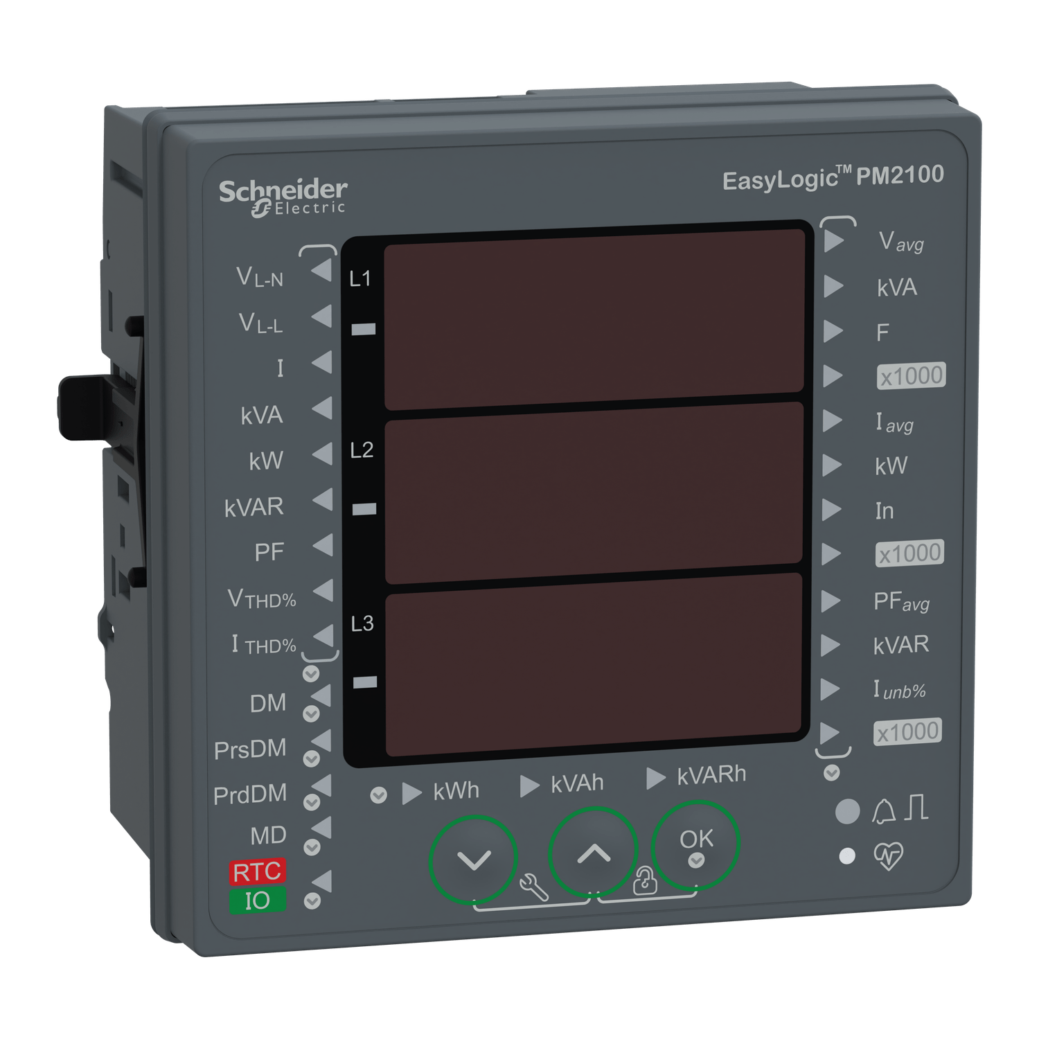 Este dispositivo é um medidor de potência de montagem em painel ou embutida com um tamanho de moldura de 96 mm por 96 mm com 3 linhas de display LED vermelho brilhante de 4 dígitos e 14,2 mm de altura.,O medidor mede a energia ativa de acordo com a classe de precisão Classe 1.0 em conformidade com a norma IEC 62053-21 com taxa de amostragem de 64 amostras por ciclo.,Capaz de medir todos os três vetores de potência e energia como Ativo, Aparente e Reativo ao lado de Tensões, Corrente, Frequência e Fator de Potência.,Mais a distorção harmônica total para corrente e tensão por fase.,O medidor funcionará na frequência de rede de 50 Hz ou 60 Hz e aceita tensões de alimentação de controle universal variando de 44 a 300 V de linha a tensões neutras CA ou CC.,A corrente nominal para este medidor é de entrada 1A ou 5A.,ele suporta até 13 tipos diferentes de esquemas de fiação em tipos de configuração monofásica, bifásica ou trifásica.,A faixa de tensão de medição entre as fases é de 35 a 480 V linha a linha CA de 45 a 65 Hz, enquanto é de 20 a 277 V entre linha e neutro.,O medidor também possui uma saída de pulso digital para quaisquer parâmetros de energia configuráveis para diferentes escalas de energia.,As dimensões do produto são as seguintes: largura 3,78 pol (96 mm), profundidade 2,16 pol (54 mm), altura 3,78 pol (96 mm) e peso do produto 10,58 onças (300 g).