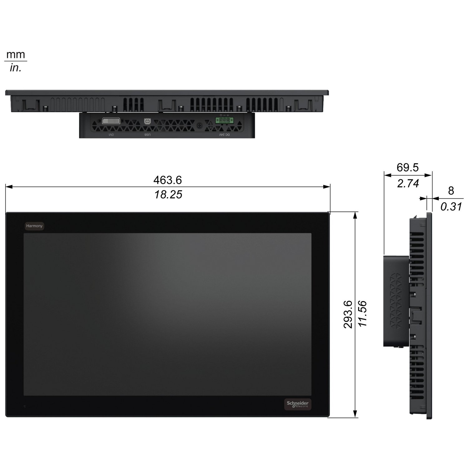 Este monitor industrial de tela plana pertence à linha Harmony FP6 da Schneider Electric.. Este display HMIFP6 capacitivo projetado multitoque de 2 pontos possui um design de superfície com tampo de vidro e vida útil de luz de fundo de 50.000 horas.. HMIFP6800WCD é uma tela ampla de 18. 5 polegadas com 16 milhões de cores e resolução de 1.920 × 1.080 pixels (FHD). Três configurações de modo de toque estão disponíveis: modo padrão. modo luva e modo de detecção de água.. A modularidade do display FP6 facilita entregas rápidas. múltiplas escolhas. montagem mais fácil e ergonomia ideal.. O painel frontal. quando instalado corretamente em um gabinete. fornece grau de proteção IP66F. IP67F. Tipo 1. Tipo 4X (somente para uso interno NEMA) e Tipo 12 e Tipo 13.. O consumo de energia quando este monitor FP6 é emparelhado com box modulares é de 30. 6 Wmáx.. Suas dimensões são 463. 6mm (largura) x 293. 6mm (altura) x 67. 5mm (profundidade) e pesa 6. 30Kg.. Suas dimensões são 463. 6mm (largura) x 293. 6mm (altura) x 67. 5mm (profundidade) e pesa 6. 30Kg.. O monitor de tela plana industrial Harmony FP6 atende a máquinas complexas. monitores de linha e processos no nível de controle de borda e análise de aplicativos do EcoStruxure.. Está em conformidade com as normas CE. RCM. UL 61010-2-201. UL 121201 e CSA C22.2 No. 61010-2-201. CSA C22.2 No. 213. IECEx/ATEX para uso em Zona 2 (gás)/Zona 22 (poeira).. Este monitor. quando combinado com qualquer um dos Harmony P6. Harmony iPCs ou dispositivos de terceiros. forma um Panel PC.. Ele pode ser montado no gabinete frontal ou na montagem VESA 100 × 100 na parte traseira do Box PC.. Os elegantes e amplos displays Harmony FP6 proporcionam alta visibilidade durante a operação. apresentando painel multitoque capacitivo com tampo de vidro. moldura estreita e design fino.