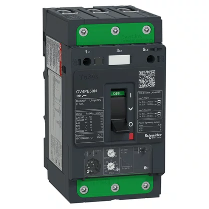 Disjuntor motor TeSys GV. 3 polos (3P). 50A/690V. para proteção de motores trifásicos 11-22kW@400V.. Ele fornece proteção termomagnética e funções adicionais de proteção do motor. capacidade de interrupção Icu 50kA@400V. controle start-stop por alternância. conexão por terminais de parafuso Everlink BTR.. Proteção térmica ajustável por indicadores com uma corrente de ajuste Ir na faixa de 20-50A e uma classe de disparo selecionável 10 ou 20. proteção magnética em 17 In.. Proteções adicionais têm pick-up fixo e incluem proteção de retardo de tempo curto Isd em 13 Ir. desequilíbrio de fase e proteção contra perda. proteção contra falha de aterramento.. Disponibiliza localizações internas para blocos de contato auxiliares adicionais (OF. SD) e unidades de disparo de tensão (MN. MX).. Certificação multipadrões (IEC. UL. CSA. CCC. EAC. Marine. ATEX). compatível com Green Premium (RoHS/REACh).