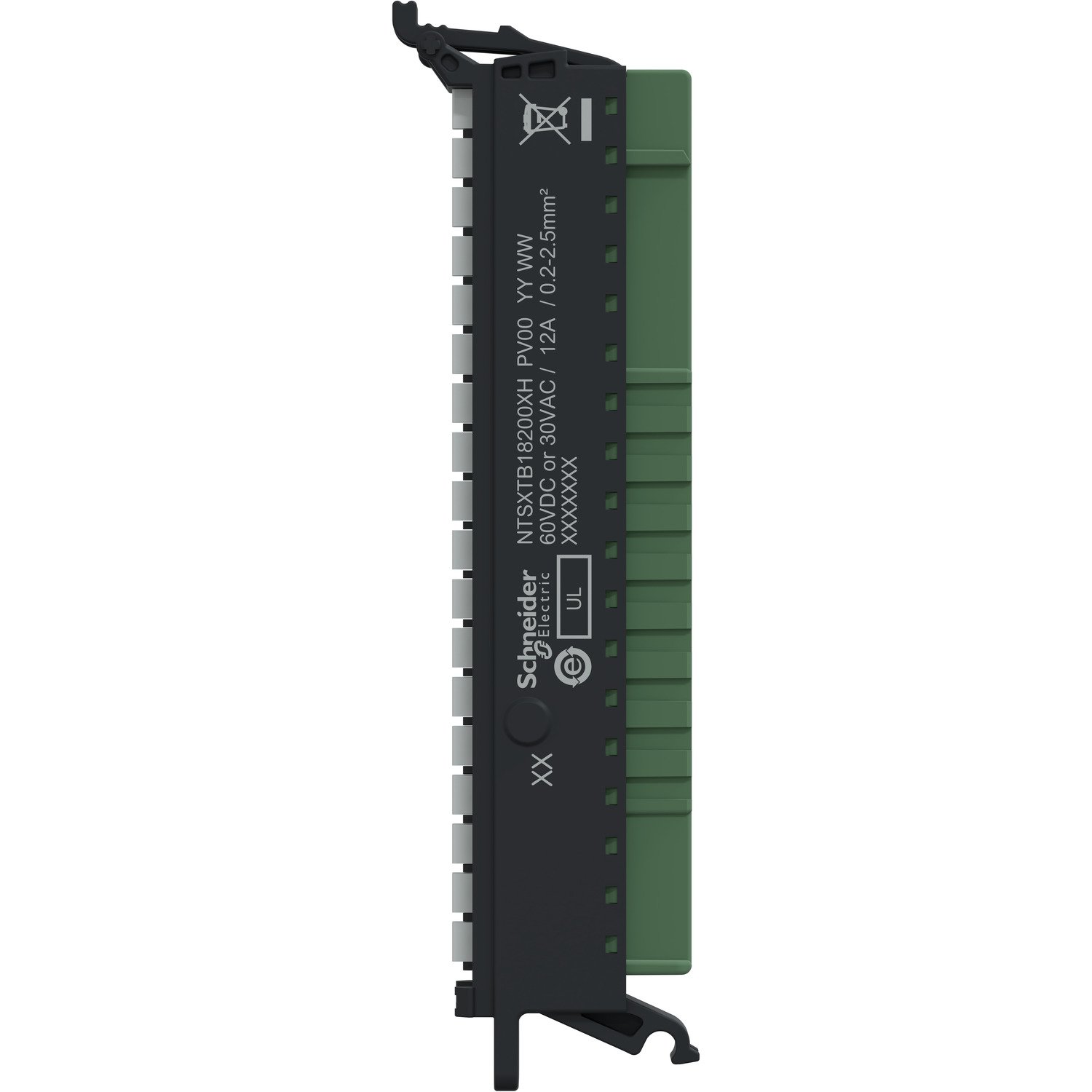 Este bloco de terminais de mola faz parte da linha Modicon Edge I/O NTS. É um bloco de terminais de mola sem tampa plástica para uso em módulos de 121 mm de altura. Possui 18 pontos de conexão, passo de 5 mm e suporta tensão CC. Este bloco de terminais removível permite a desconexão rápida e fácil da fiação, minimizando o tempo de inatividade do sistema durante manutenção ou solução de problemas. Funciona em uma faixa de temperatura de -40 a 70 graus Celsius. Possui classificação de proteção IP20 e se beneficia de um revestimento protetor. É compatível com módulos de entrada analógica e de E/S discretas. É vendido individualmente por pacote. Conecta-se à face frontal do módulo. O Modicon Edge I/O NTS é um sistema de E/S pronto para o futuro para agregação de dados. O Modicon Edge I/O NTS é um sistema de E/S IP20 distribuído e robusto com ampla variedade de módulos.