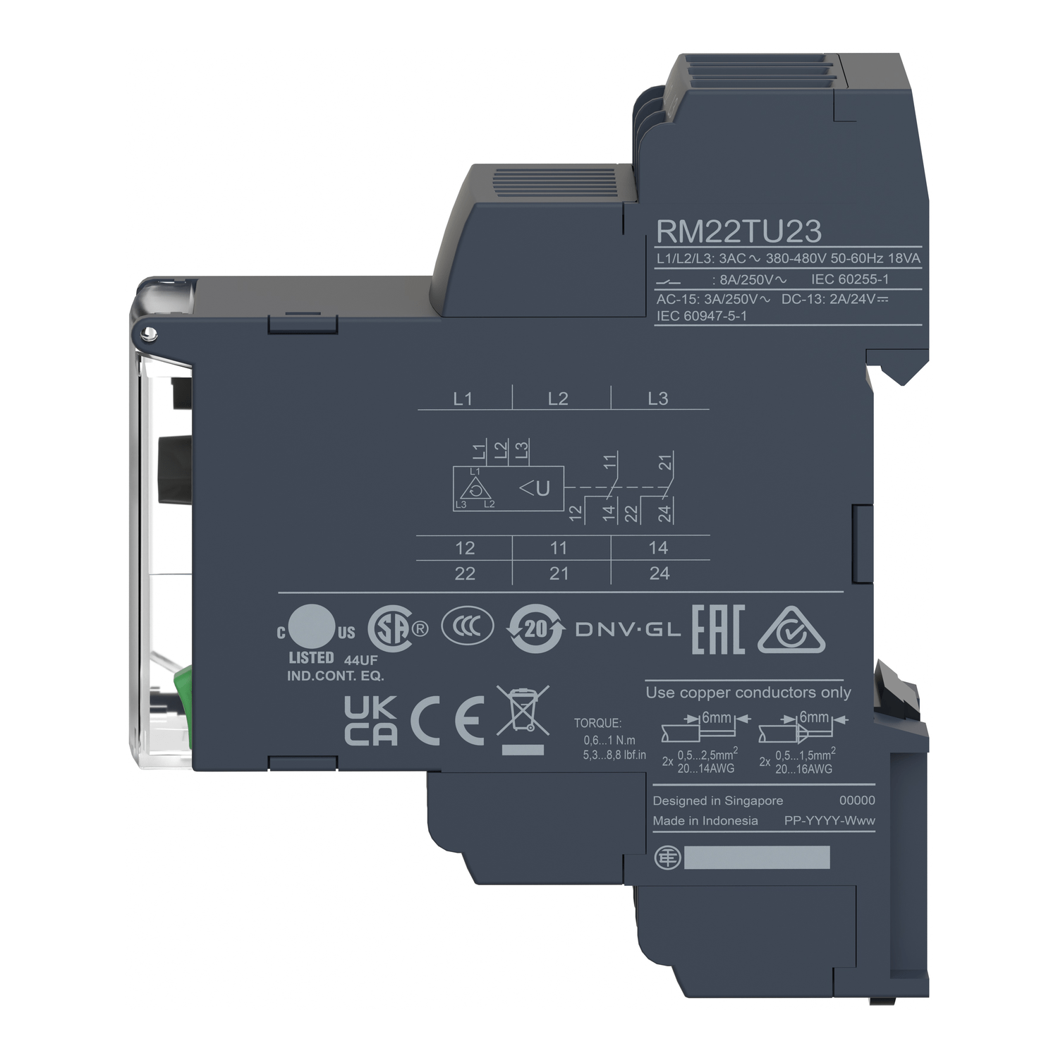 O RM22TU23 é um relé de medição de redes trifásicas da linha Harmony RM22.Este relé modular multifuncional de controle de alimentação trifásico é ideal para monitoramento de valores elétricos em painéis de controle industriais e prediais.Aplica-se a um amplo tipo de aplicações de automação industrial, como içamento, embalagem, elevadores, têxteis, água.Possui um dos formatos mais finos do mercado, permitindo uma instalação fácil e flexível em trilho DIN, usando o mesmo espaço que qualquer dispositivo DIN modular de 1 pólo.Também oferece tampa selável, ajustes simples e precisos com cortadores de parafuso.O produto monitora sua própria fonte de alimentação, quando a fonte de alimentação está anormal, o relé de saída é desenergizado.Controlador multifuncional para ampla escolha selecionada em sistemas automatizados lógicos cabeados, ideal para reforma de instalações antigas sem uso de CLP.