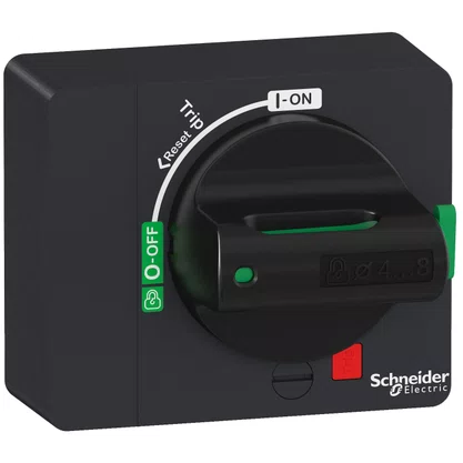 Manopla rotativa direta TeSys GV. para disjuntores motores GV4PE. LE. PEM. PB ou peça de reposição para manopla GV4P. GV4L.. Para uso do interruptor principal. ele fornece uma manopla preta em um painel preto com indicação de 3 posições OFF. ON. TRIP.. Equipado com um botão \push to trip\.. Pode ser trancado na posição OFF ou ON com até 3 cadeados (a serem pedidos separadamente).. O travamento na posição ON não impede o disparo do disjuntor (o desbloqueio é necessário para o reset da falha).. Compatível com Green Premium (RoHS/REACH).