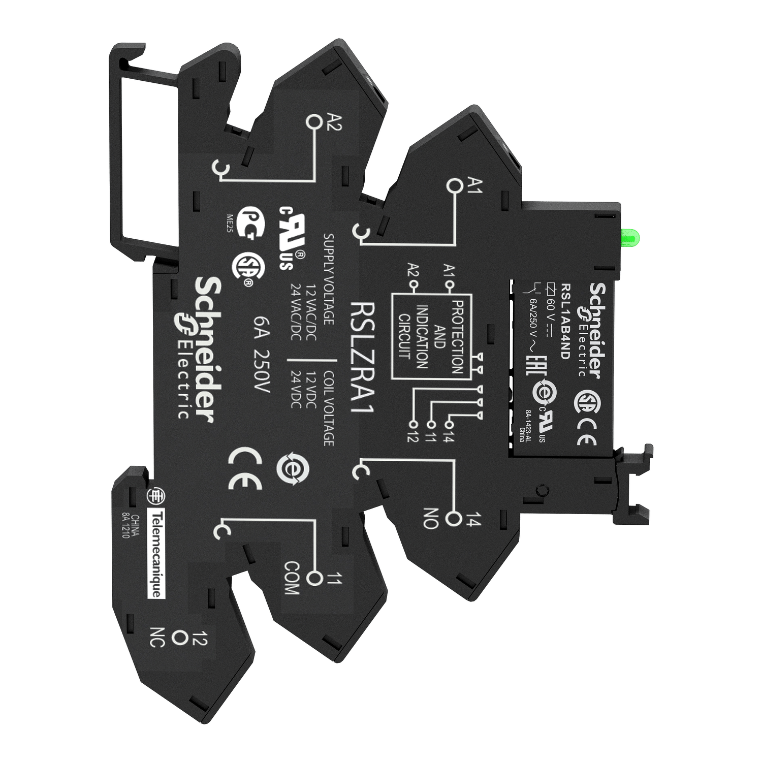 Este relé de ligação de interface fina Harmony RSL tem uma tensão de controle de bobina de 24 V CC e tem 1 contato de inversor SPDT (polo simples de duas direções) com uma classificação de 6 A.,Ele tem uma grande variedade de número de contatos para uso em corrente nominal elevada.,Também oferece indicador LED e circuito de proteção.,Isso ajuda a reduzir o tamanho dos gabinetes e aumenta a confiabilidade das máquinas. Você pode montar praticamente em qualquer lugar.,Um dos relés de interface mais finos do mercado, com 6 mm de largura, pode ser instalado em praticamente qualquer lugar.,É compatível com requisitos de aplicação de corrente de alto nível ou alta capacidade de interrupção.,Operacionalidade para sistemas automatizados com lógica cabeada para complementar as funções de controladores lógicos programáveis (CLPs) industriais.,O display de estado com LED indica claramente tanto de dia como de noite.