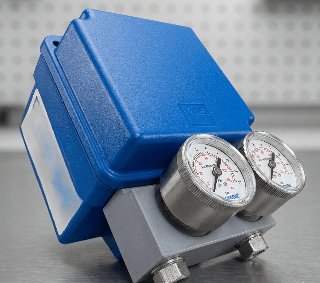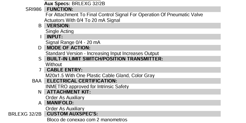 Posicionador Eletro Pneumático modelo SRI986 Foxboro by Schneider, tecnologia bico palheta, simples ação, sinal 4 a 20mA, modo de ação direta, conexão pneumática ¼” NPT, conexão elétrica M20x1,5, involucro em alumínio, INMETRO Ex ia IIC T6, manifold com 2 manômetros, garantia de 2 anos