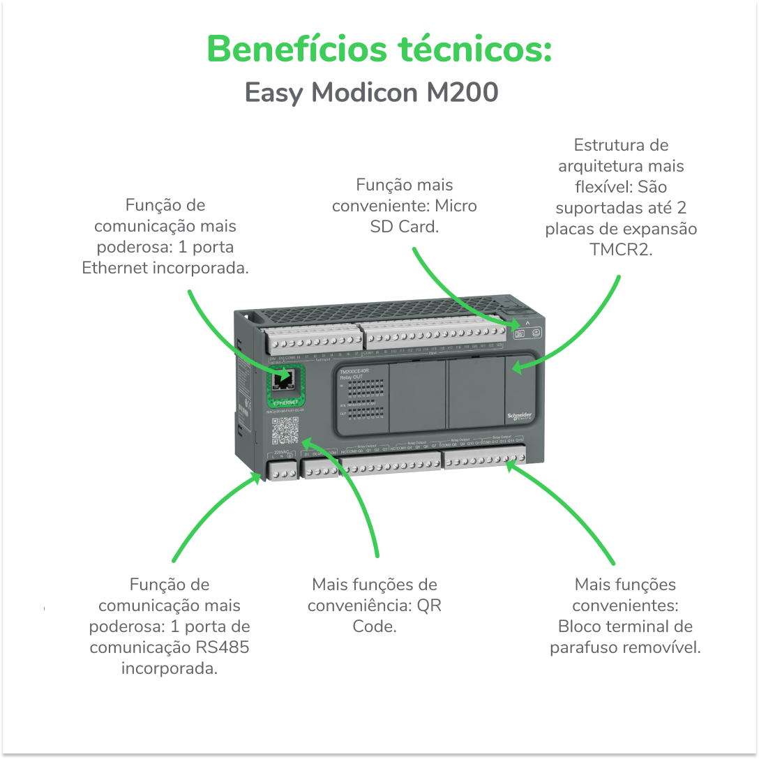O TM200CE40R é um controlador lógico da linha de produtos Easy Modicon M200. É utilizado para automação industrial e possui uma série de recursos e especificações técnicas. O controlador é alimentado por uma tensão nominal de 100 a 240 V CA. Ele possui um total de 40 E/S digitais, incluindo 4 entradas rápidas (I2...I5), 4 entradas de alta velocidade (I0, I1, E6, E7) e 16 entradas normais (I8...I23). As entradas digitais operam com uma tensão de 24 V CC e uma corrente de entrada de 7 mA. No que diz respeito às saídas digitais, o controlador possui 16 saídas de relé normalmente abertas. A tensão de saída para as saídas digitais pode ser de 24 V CC ou 220 V CA, e a corrente de saída é de 2 A. O controlador também oferece a possibilidade de expansão de I/O com até 4 módulos, permitindo adicionar 128 saídas transistorizadas ou 80 saídas de relé. O controlador possui várias opções de conectividade, incluindo uma porta USB com conector mini B USB 2.0, conexões seriais RS232/RS485, Ethernet TCP/IP Modbus e uma porta Ethernet 10/100BASE-T. Suporta taxas de transmissão de até 115,2 kbit/s para RS485 e 12 Mbit/s para USB. Outros recursos incluem capacidade de memória interna de 512 bytes para backup de programas, suporte a um cartão micro SD de até 32 GB para armazenamento de dados, bateria de lítio (BR2032) com duração de até 5 anos e backup de até 3 anos em caso de interrupção do fornecimento de energia. O controlador também possui recursos adicionais, como um regulador PID ajustável, contagem de pulsos de entrada rápida (HSC), sinalização local através de LEDs e várias opções de conexão elétrica.