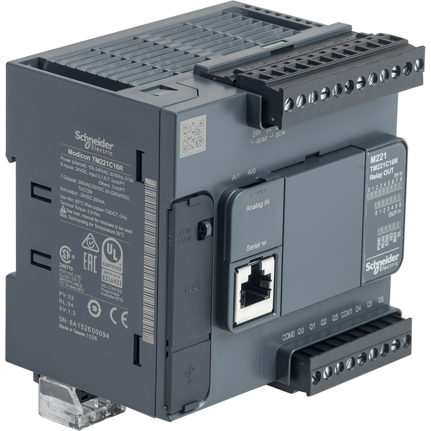 Este produto faz parte da faixa Modicon M221, uma oferta de controladores lógicos programáveis para arquiteturas com fio.Este controlador lógico fornece 9 entradas discretas e 7 saídas de relé com resolução de entrada de 10 bits, normalmente aberta saída de relé.Este produto requer instalação mínima e oferece uma enorme versatilidade.As conexões integradas são a porta USB com o conector Mini B USB 2.0, o link serial não isolado 1 com o conector RJ45 e a interface RS485 e a serial serial não isolada serial 2 com o conector RJ45 e a interface RS232/RS485.É um controlador Modicon M221 com uma frequência de rede de 50/60Hz, 256kb para variáveis internas RAM, aplicativo de usuário e RAM de dados, memória flash integrada de 256kb e capacidade de memória de cartão SD de 2 GB.É um produto com classificação IP20.Suas dimensões são de 95 mm (largura) x 70 mm (profundidade) x 90 mm (altura).Ele pesa 0,346 kg.
